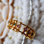 La bague RANG est ornée de tourmalines multicolores, apportant équilibre et joie. Chaque bague est unique grâce aux variations de couleurs des pierres.
