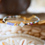 Le bracelet ADVITIYA est une symphonie de couleurs et d'énergies. Les tourmalines multicolores apportent équilibre et harmonie, le grenat stimule la vitalité, l'hématite ancre et protège, la nacre adoucit, et la tanzanite favorise la spiritualité. Le trèfle en nacre ajoute une touche de chance et d'élégance.