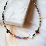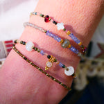 Bracelet en acier inoxydable composé de tourmalines multicolores, de grenats, d’hématites, d’un trèfle en nacre, de tanzanites et de breloques en acier inoxydable.