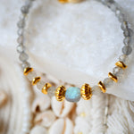 Bracelet composé de labradorites 4mm, d'une labradorite centrale de 4mm et de breloques dorées or fin