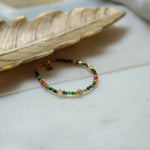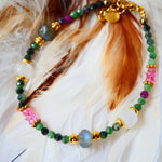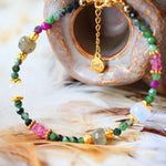 Bracelet en acier inoxydable, composé de rubis zoisites, de topazes roses, de labradorites, de pierres de lune et de breloques dorées or fin.