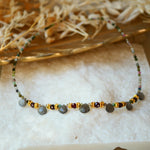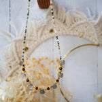 Collier en acier inoxydable, composé de tourmalines, pierres de lune grises, grenats et de breloques dorées or fin.