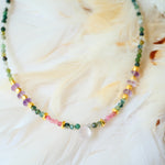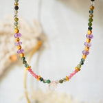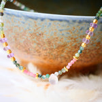Collier en acier inoxydable composé d'agates indiennes, d'améthyste, d'une goutte en quartz rose et de breloques dorées or fin.