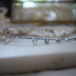 Collier en acier inoxydable composé de iolites et d'aigues marines en forme de goutte.