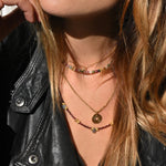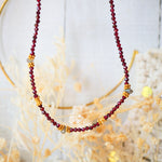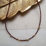 Collier en acier inoxydable, composé de grenats 3mm, de labradorites et de breloques dorées or fin.