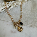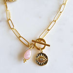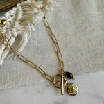 Collier en acier inoxydable, composé d’un pendentif doré à l’or fin et au choix d’un onyx ou rhodochrosite