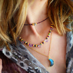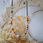 Collier en acier inoxydable, composé de rubis zoisites, améthystes, grenats et de breloques dorées or fin.