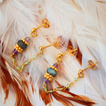 Doubles boucles d'oreilles reliées par une chaîne en acier inoxydable composées d'une chaîne en péridot, de labradorite et d'améthyste.