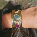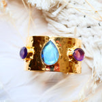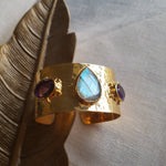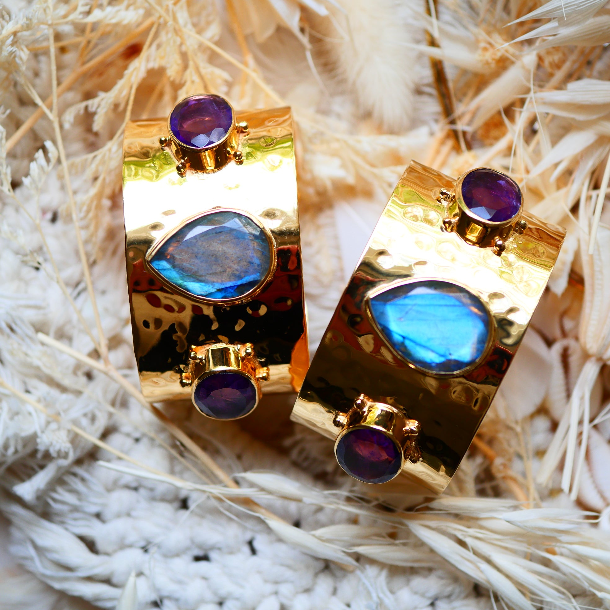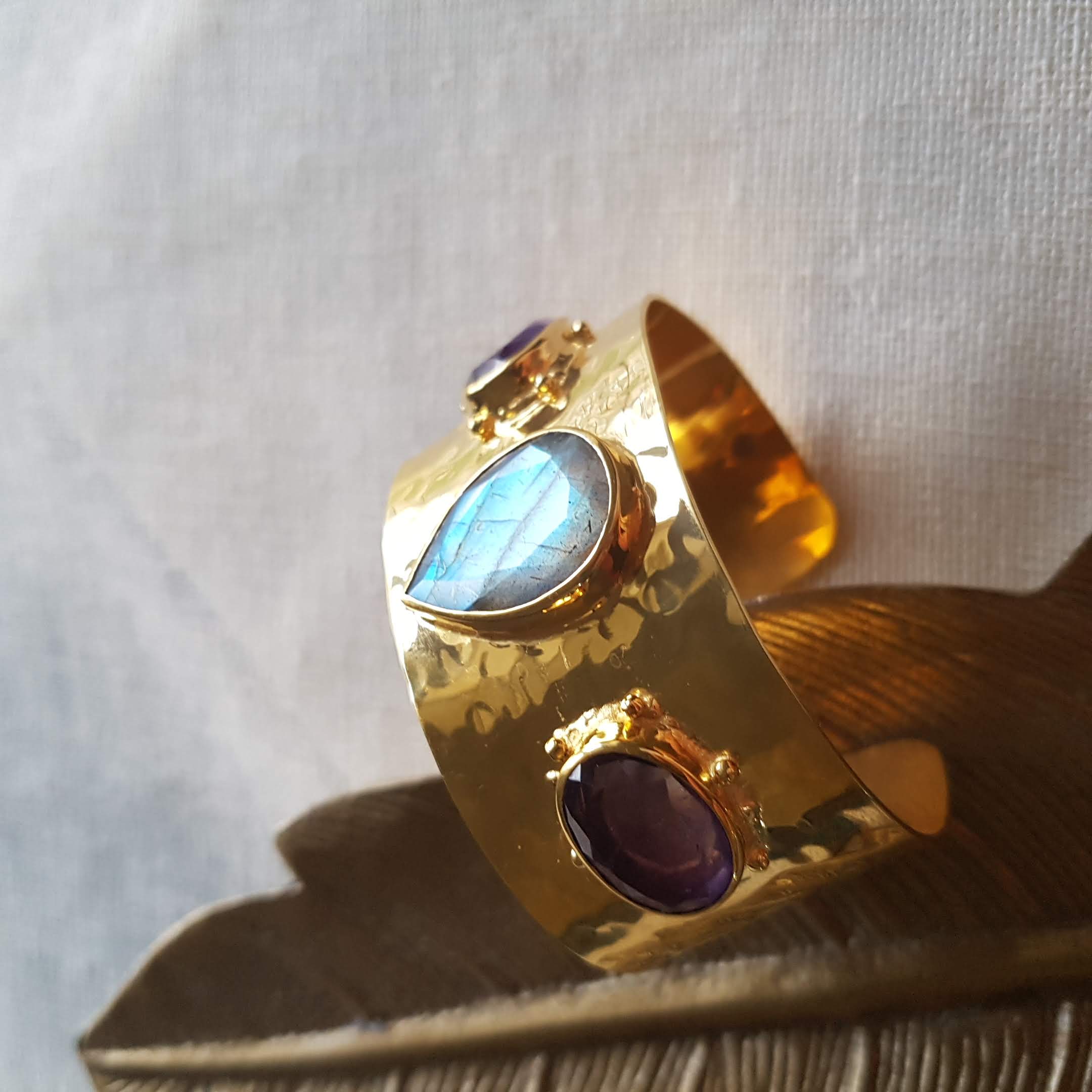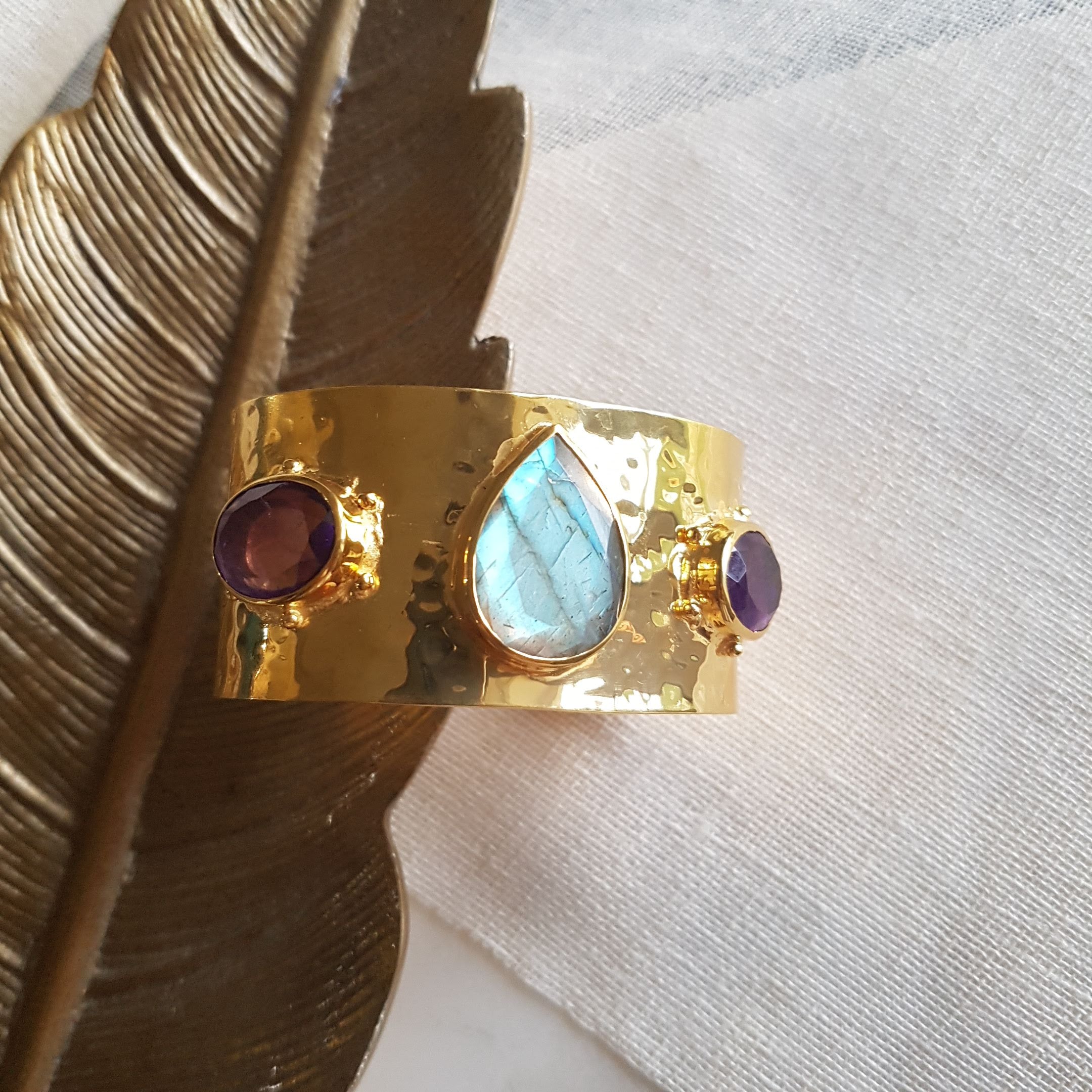 Jonc en laiton, doré or fin, orné d'une belle labradorite et de 2 améthystes.