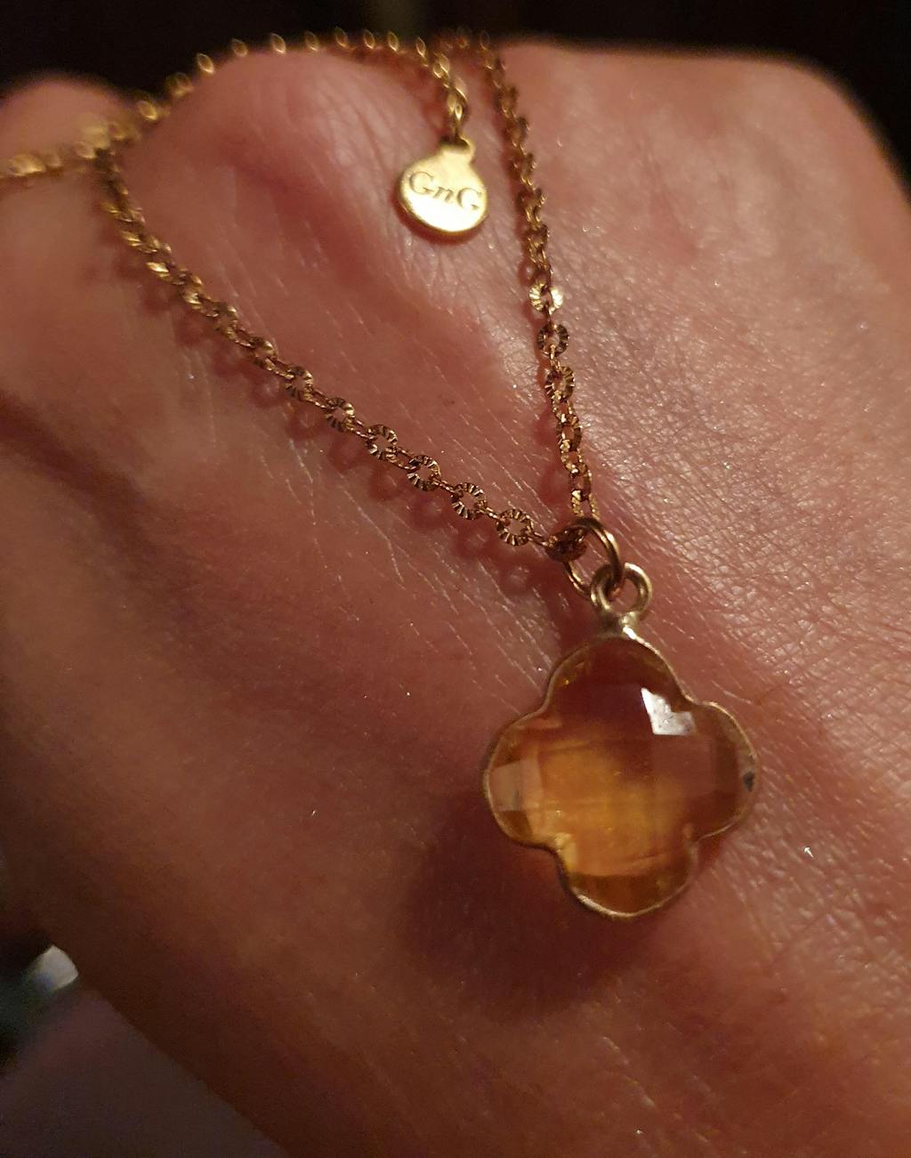 J'aime beaucoup ce collier trèfle, la citrine à un très beau éclat doré et brille sur ma peau. Je reçois beaucoup de compliments. Je le porte tous les jours. Le collier est présenté dans une jolie boîte et son petit sachet avec un gentil mot.