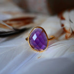 Bague Mukti Améthyste - Bague réglable en laiton doré 2 microns, ornée d’une améthyste naturelle (dimensions environ 17x8mm). Réglable de la taille 54 à 58. Livrée dans son pochon.