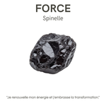 Spinelle Noir : Pierre rare et puissante, le spinelle noir est un bouclier énergétique de premier ordre. Il repousse les attaques psychiques, transmute les énergies négatives et renforce l’aura. Pierre de résilience, il aide à surmonter les épreuves avec dignité et force.