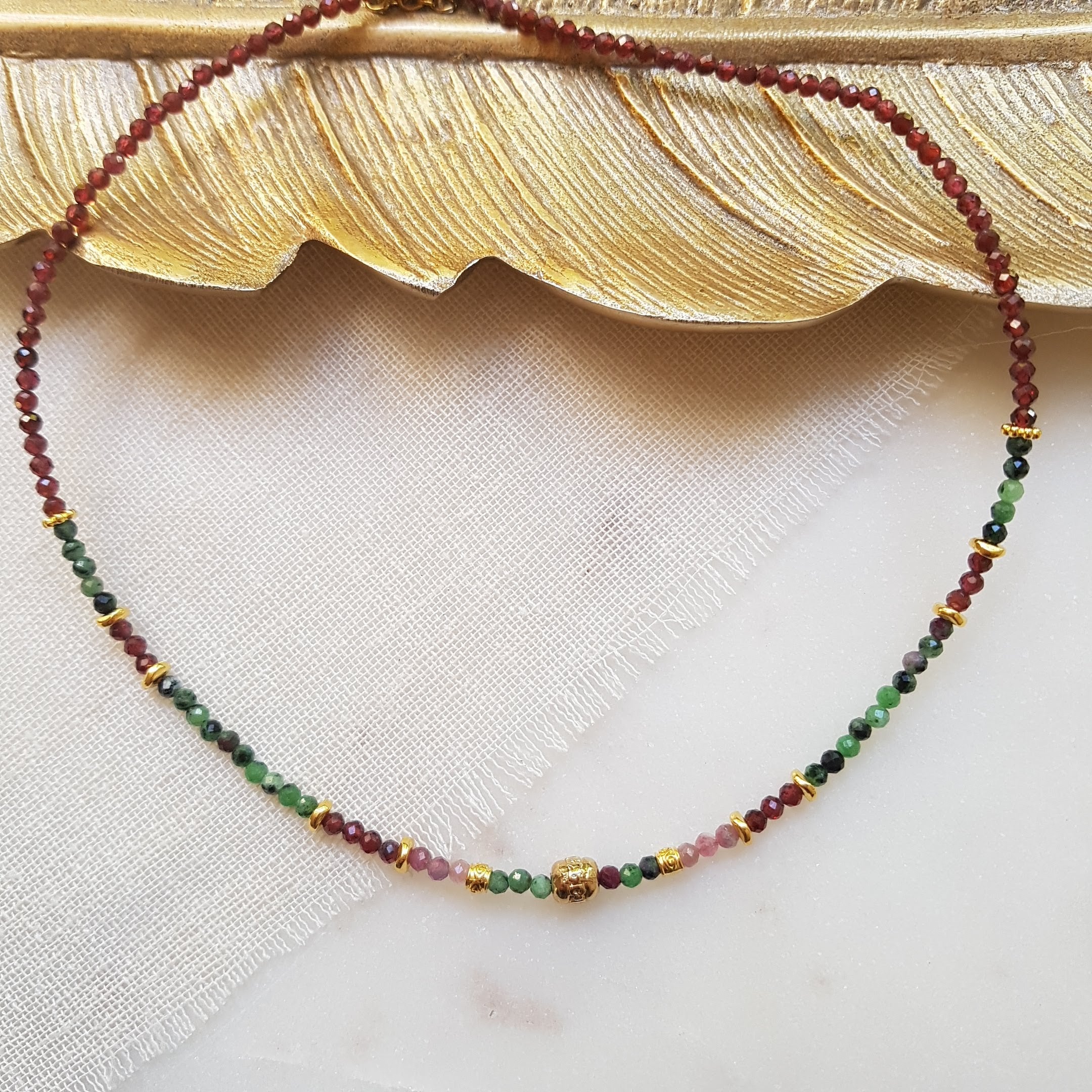 Collier en acier inoxydable, composé de grenats, de rubis zoïsites, de tourmalines roses et de breloques dorées or fin