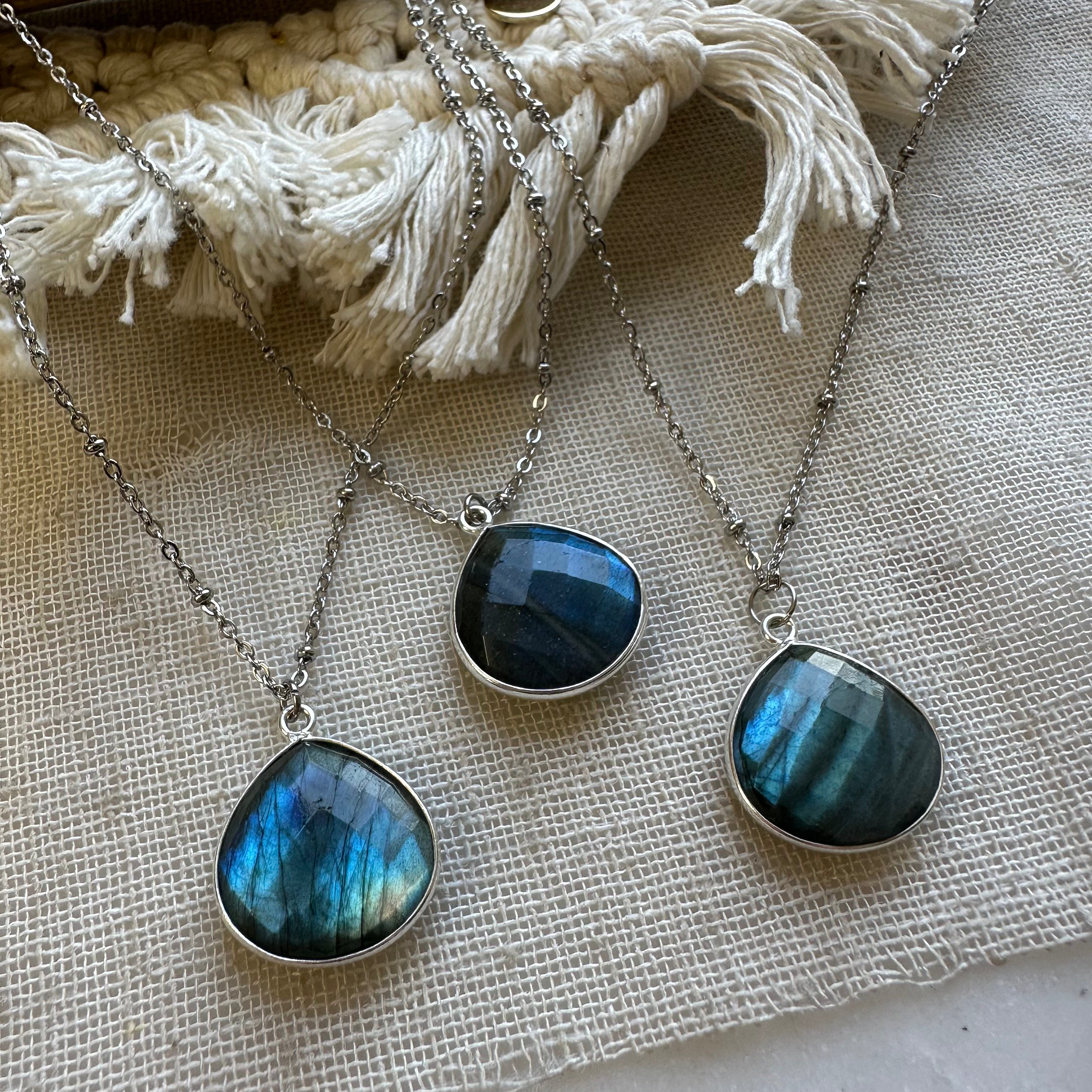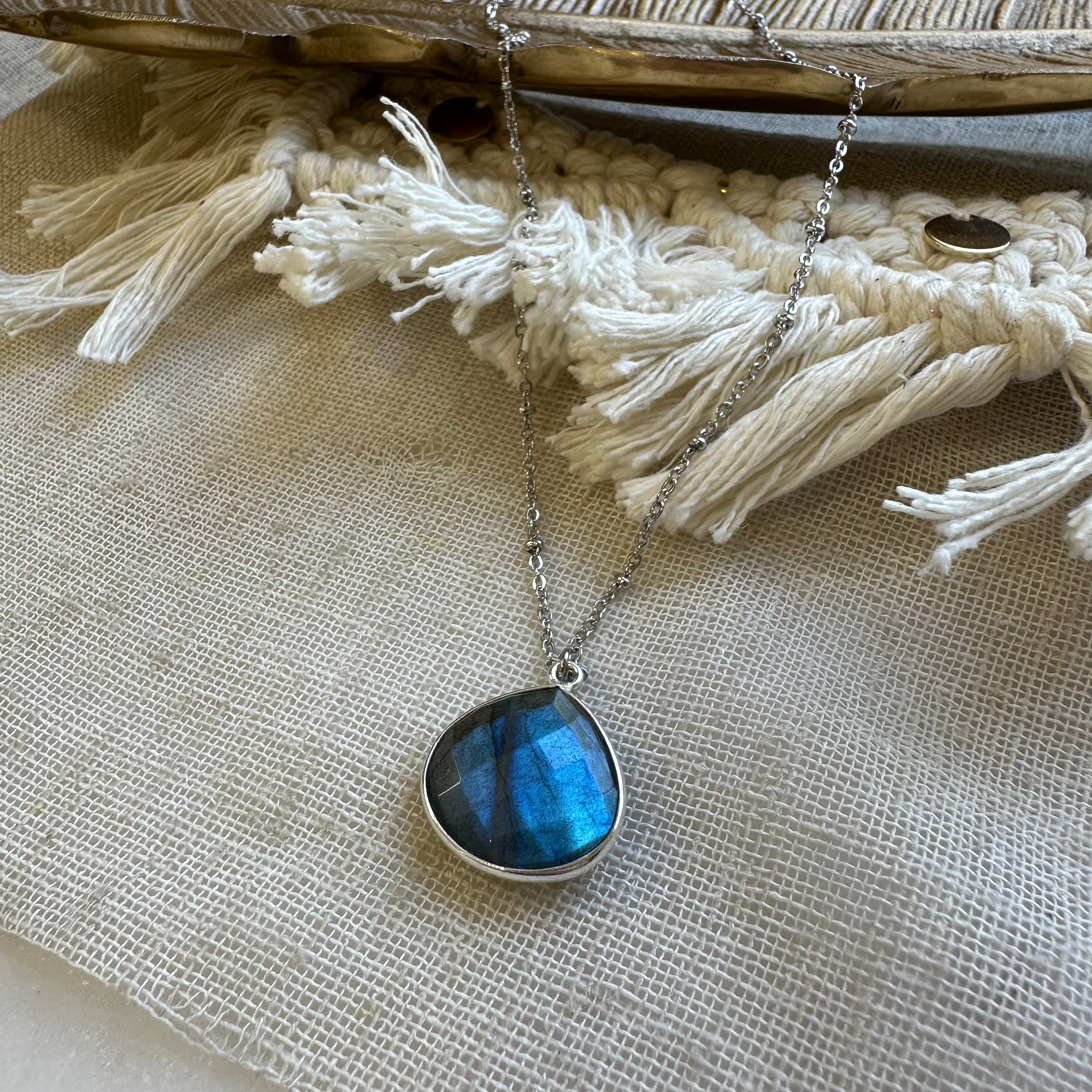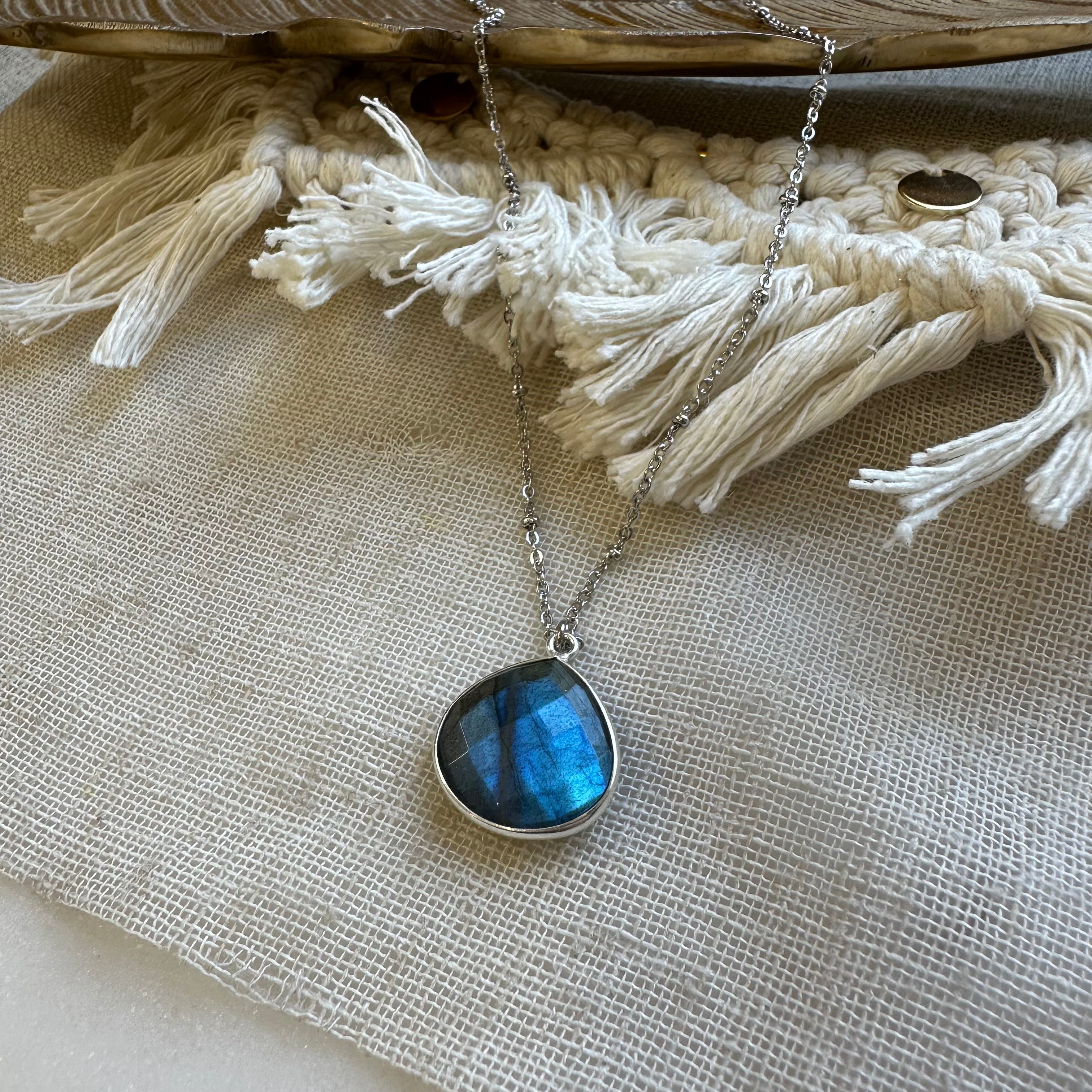 Collier acier inoxydable de couleur argenté, composé d'une pierre labradorite mesurant env 19mm
