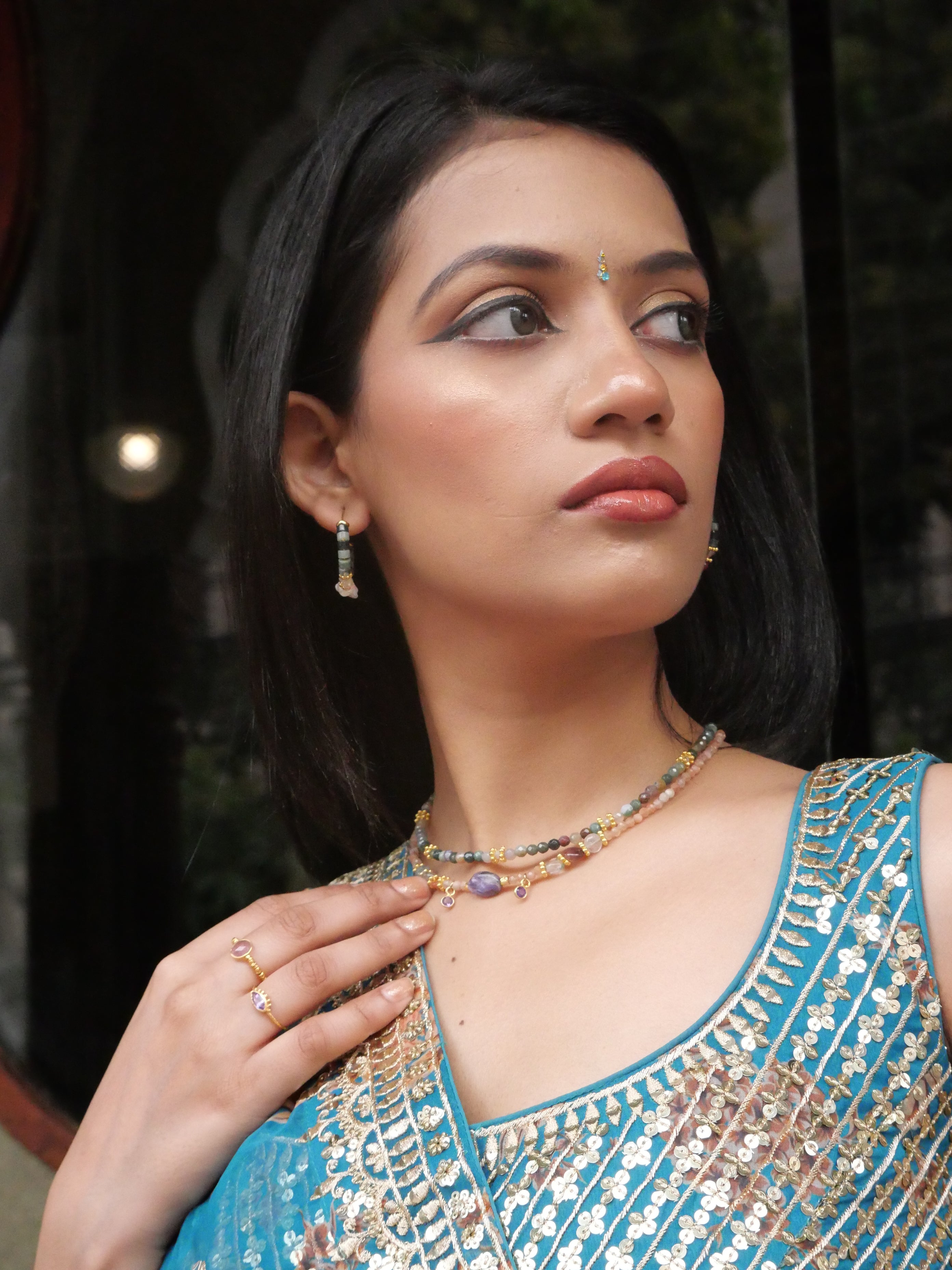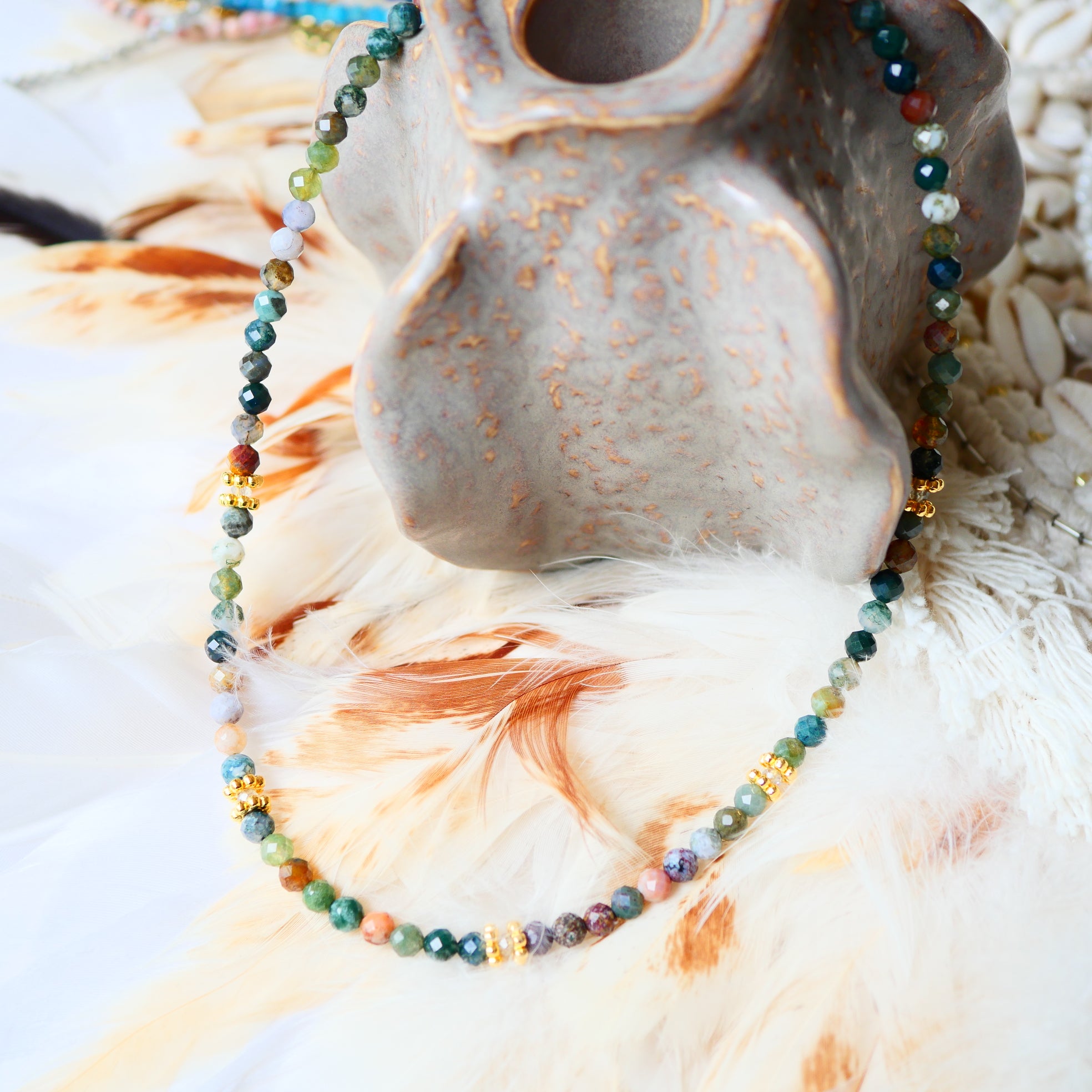 Ce collier est conçu pour vous aider à vous connecter avec la force de la terre et de l'univers. L'agate indienne est connue pour favoriser la créativité et la chance tandis que la labradorite est associée à la magie et à l'intuition. Ensemble, ces pierres créent une énergie puissante qui peut vous aider à surmonter les défis de la vie avec grâce et courage.