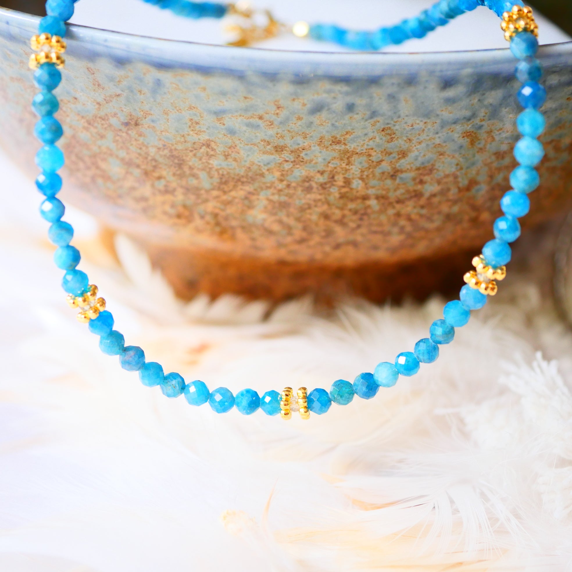 Collier composé d'apatites, zironcs et charms dorés à l'or fin.