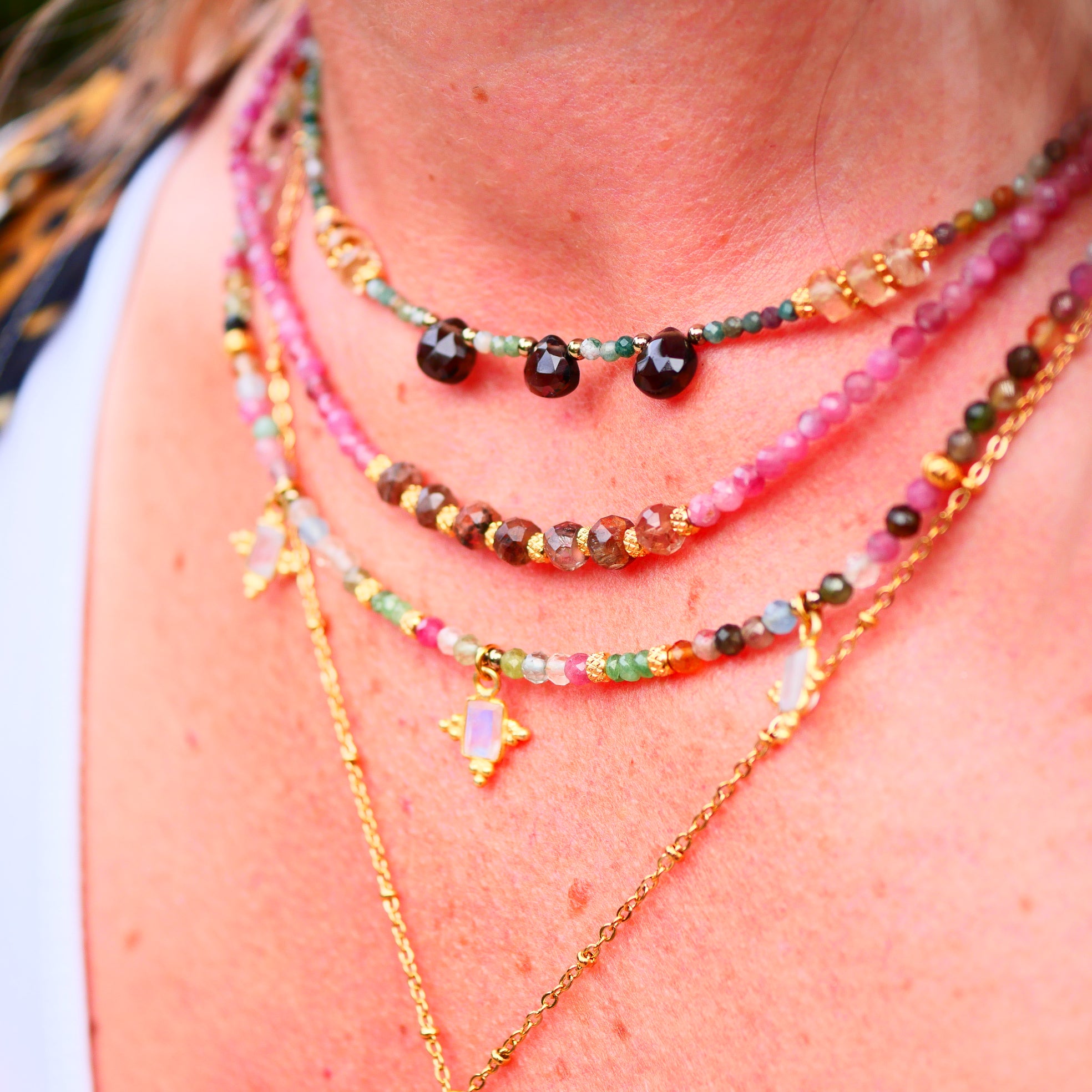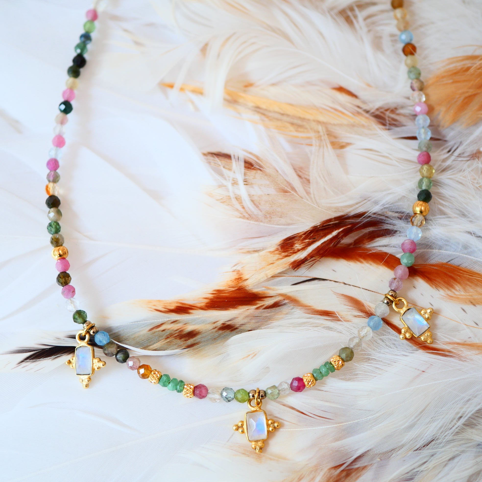 Collier en acier inoxydable, composé de tourmalines multicolores, tsavorites, pierres de lune arc-en-ciel et de breloques en acier inoxydable.