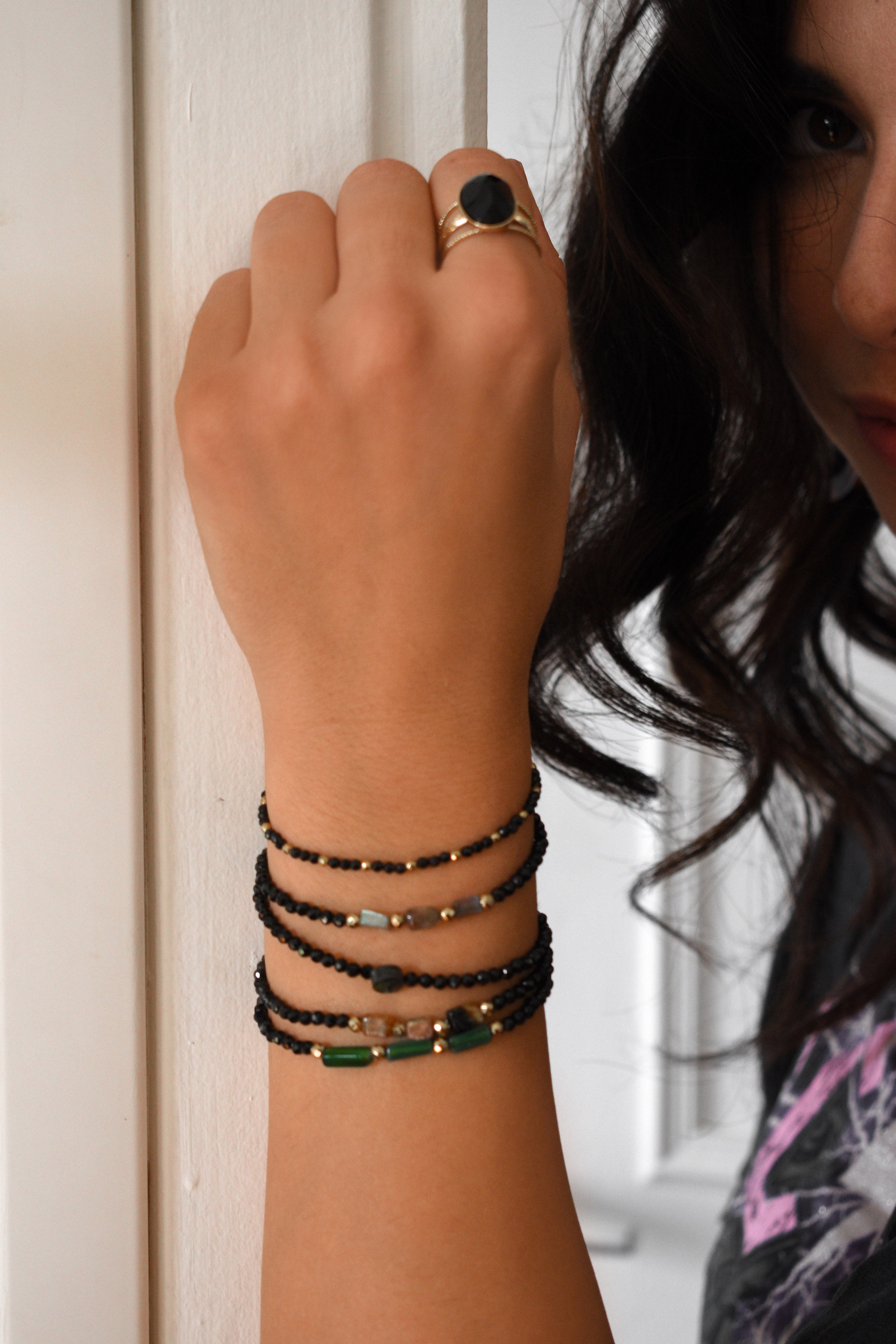 - Le bracelet aux pierres inspirantes, disponible en différentes pierres : agate indienne, lapis lazuli, rubis saphir indien, pierre de lune, turquoise, aigue marine, fluorite, quartz fumé, spinelle et tourmaline.