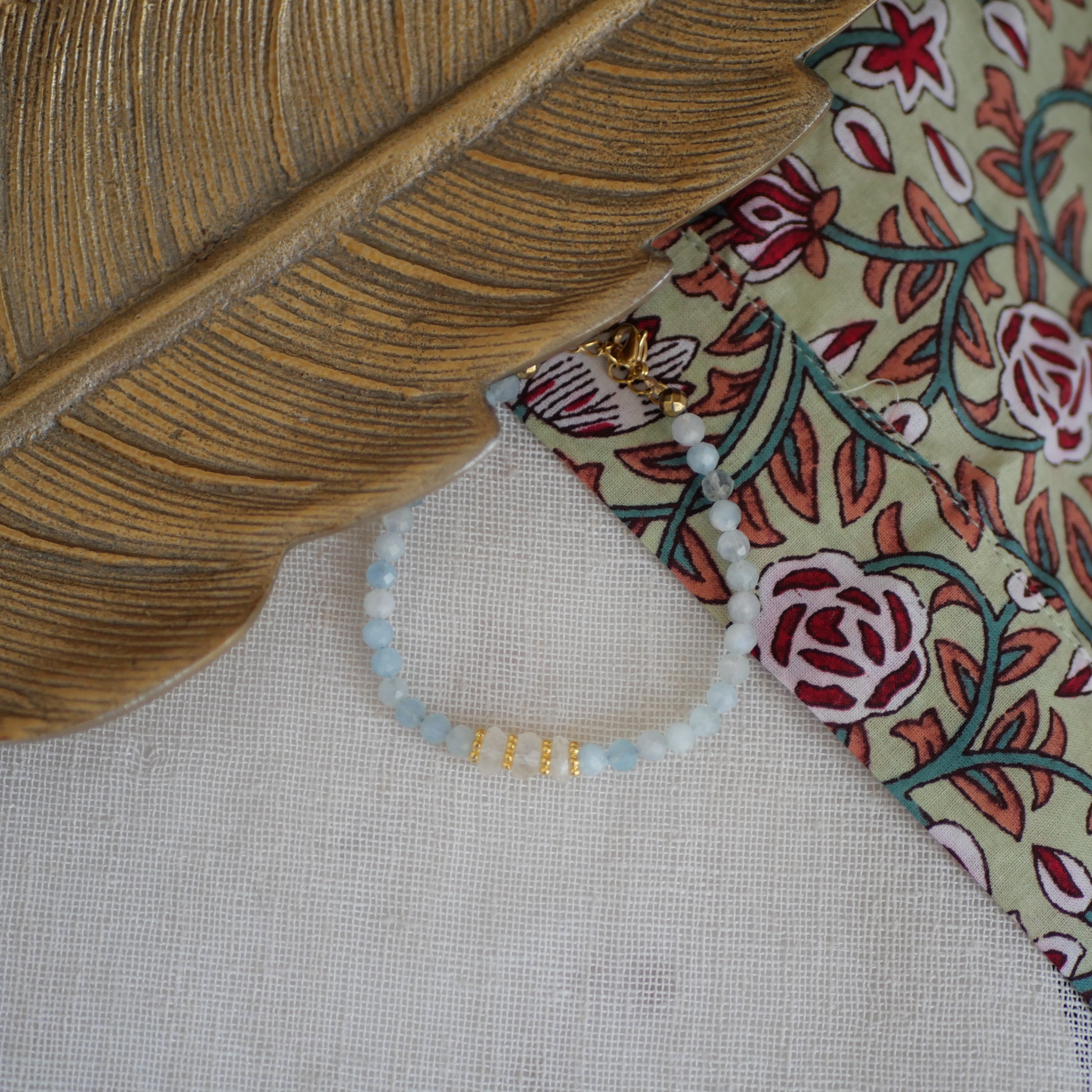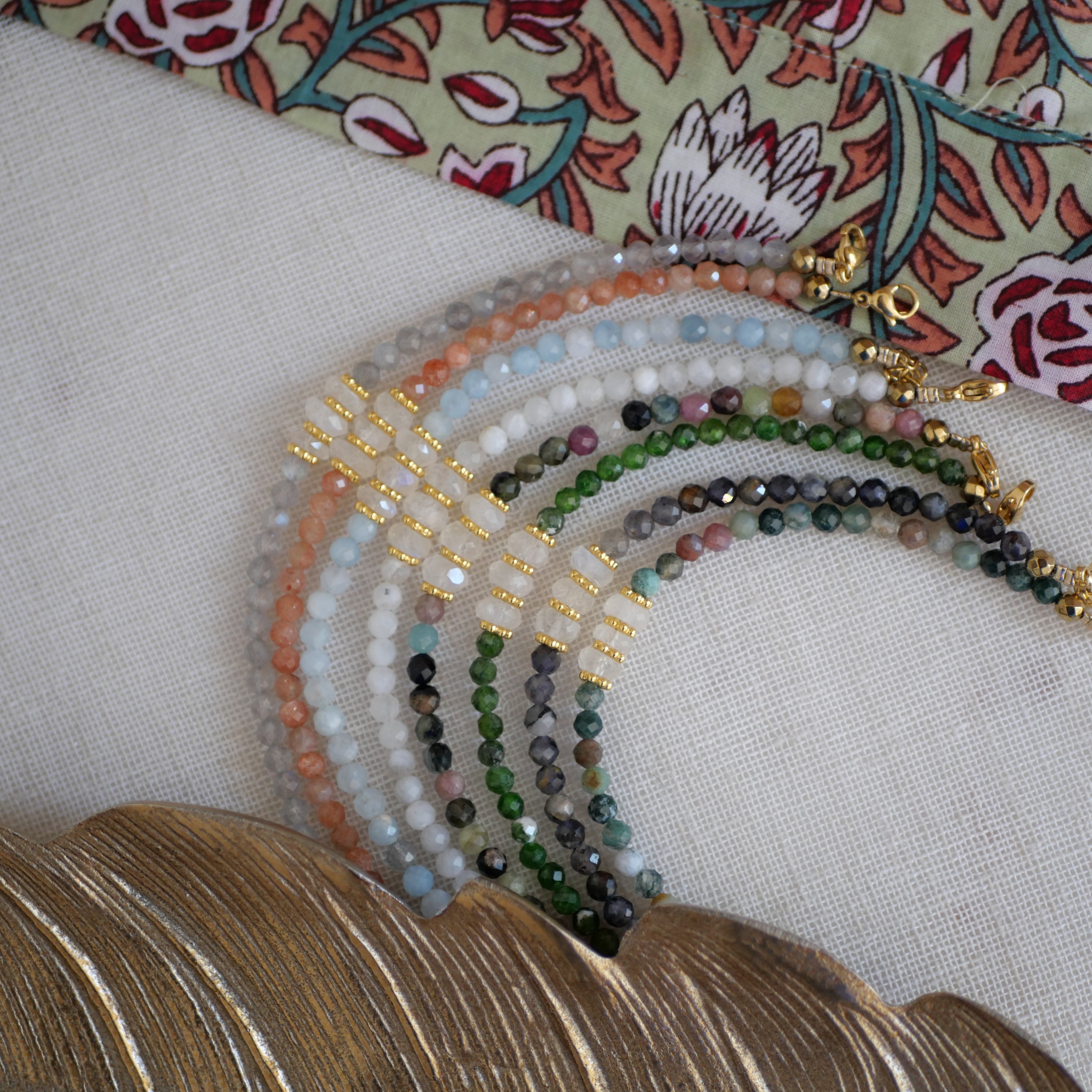 Bracelet composé de pierres au choix (pierre de soleil, aigue marine, iolite, tourmaline, agate indienne, diopside, labradorite ou pierre de lune), de trois pierres de lune centrales et de breloques dorées or fin.
