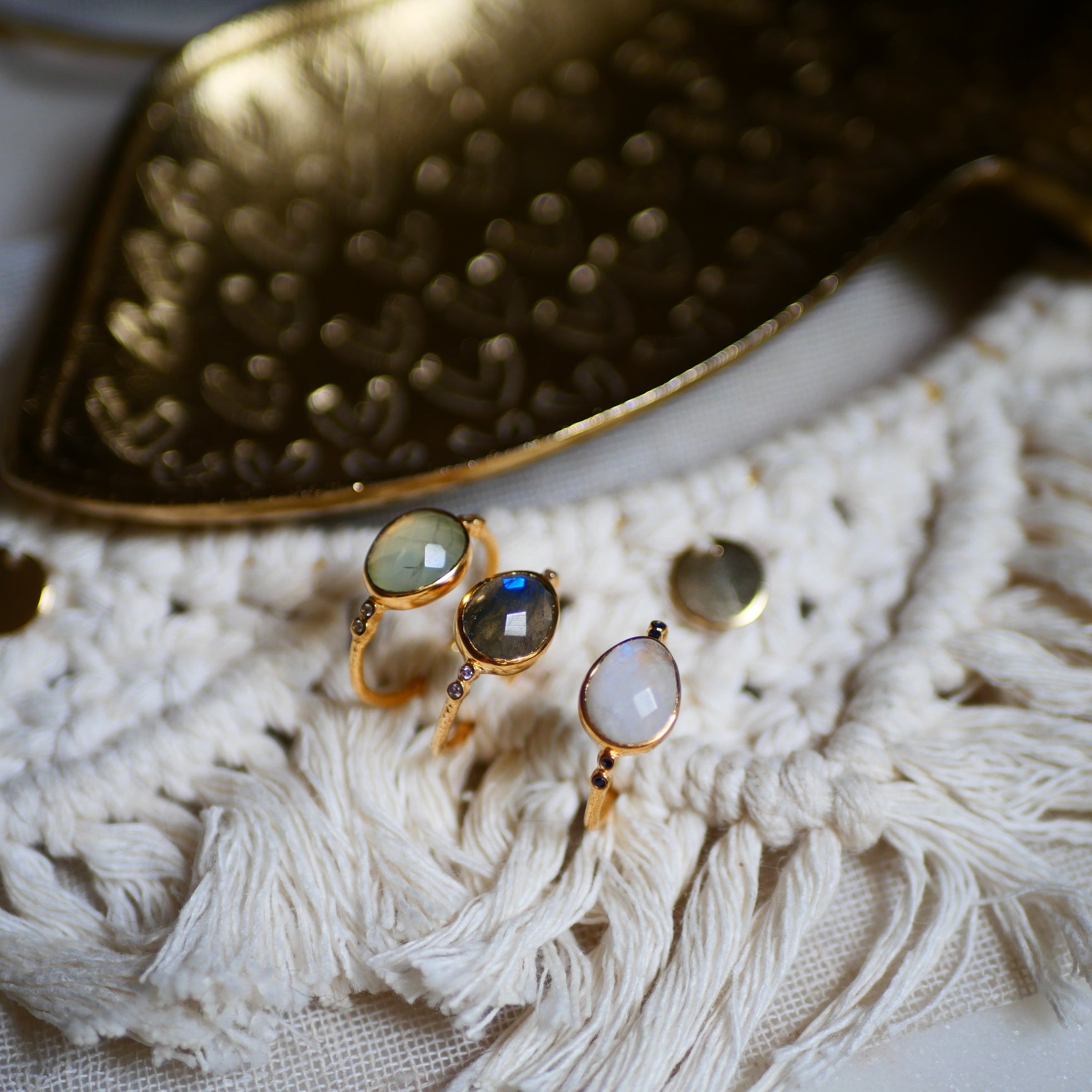 Bague en laiton doré or 2 microns 18 carats réglable de la taille 54 à 62, ornée de zircons et d'une pierre au choix : Pierre de Lune arc-en-ciel (aussi appelée Labradorite blanche ou Peristérite), Labradorite ou Prehnite