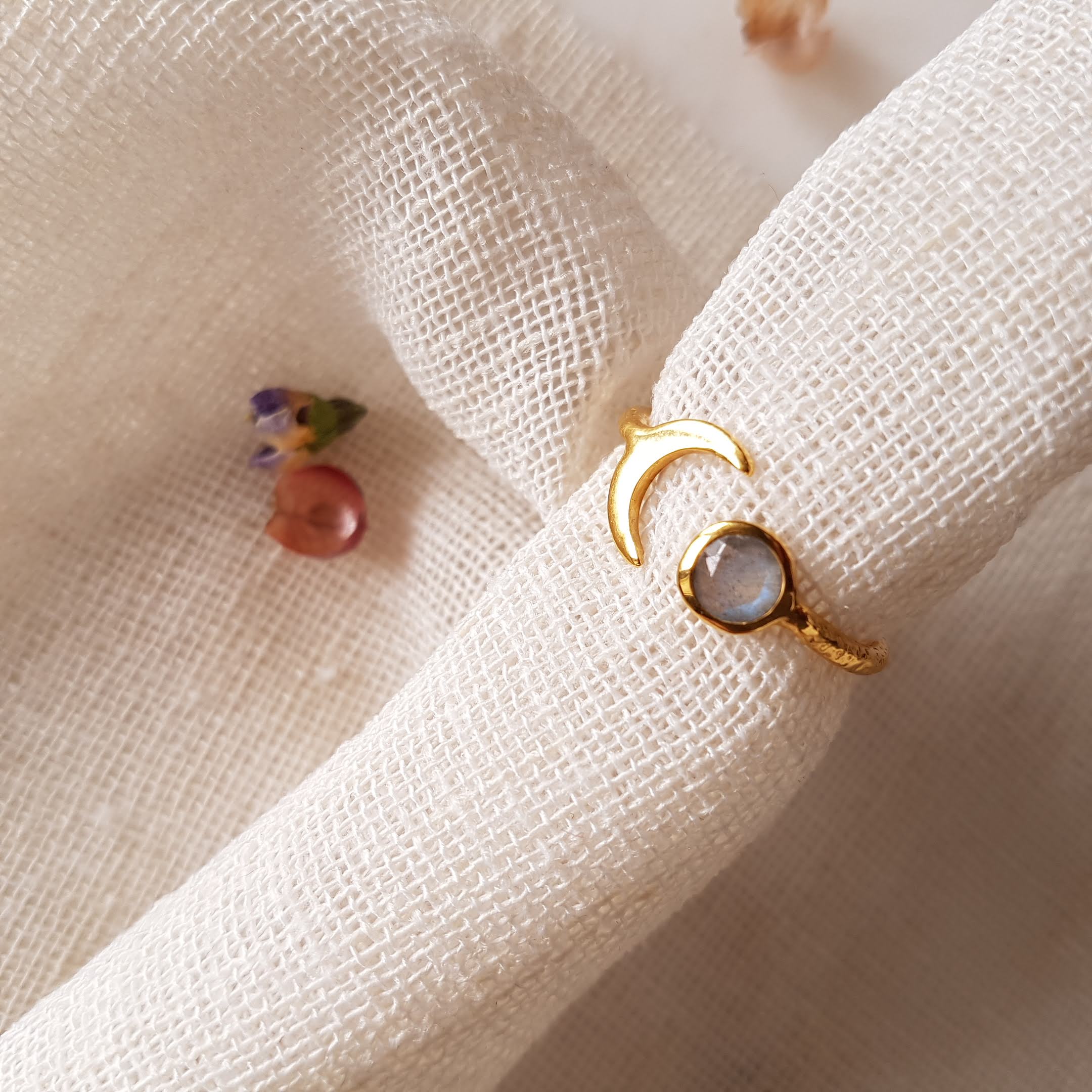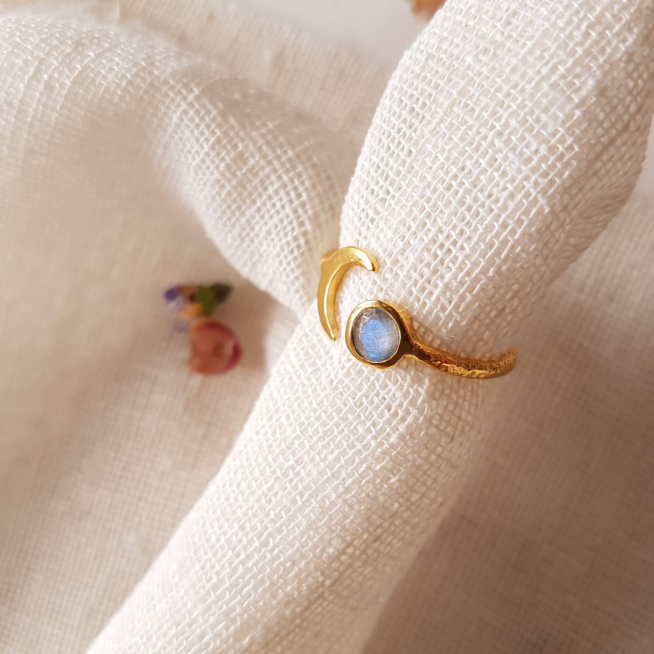 La labradorite est une pierre de guérison qui apporte calme et sérénité à l'esprit, tandis que la lune est un symbole de l'intuition et de la féminité sacrée. Cette bague réglable combine ces deux éléments pour créer un bijou unique qui vous aidera à vous connecter à votre essence intérieure.