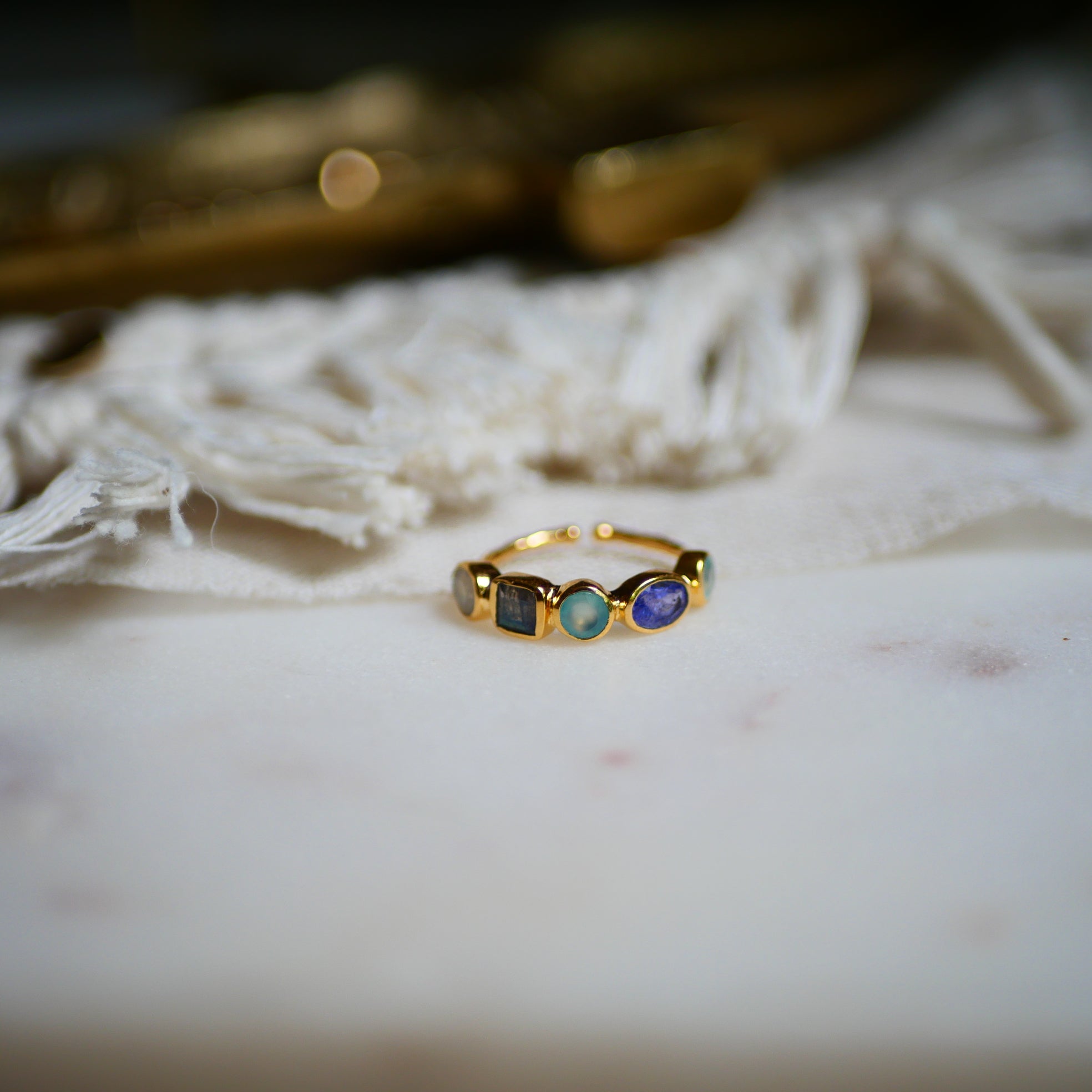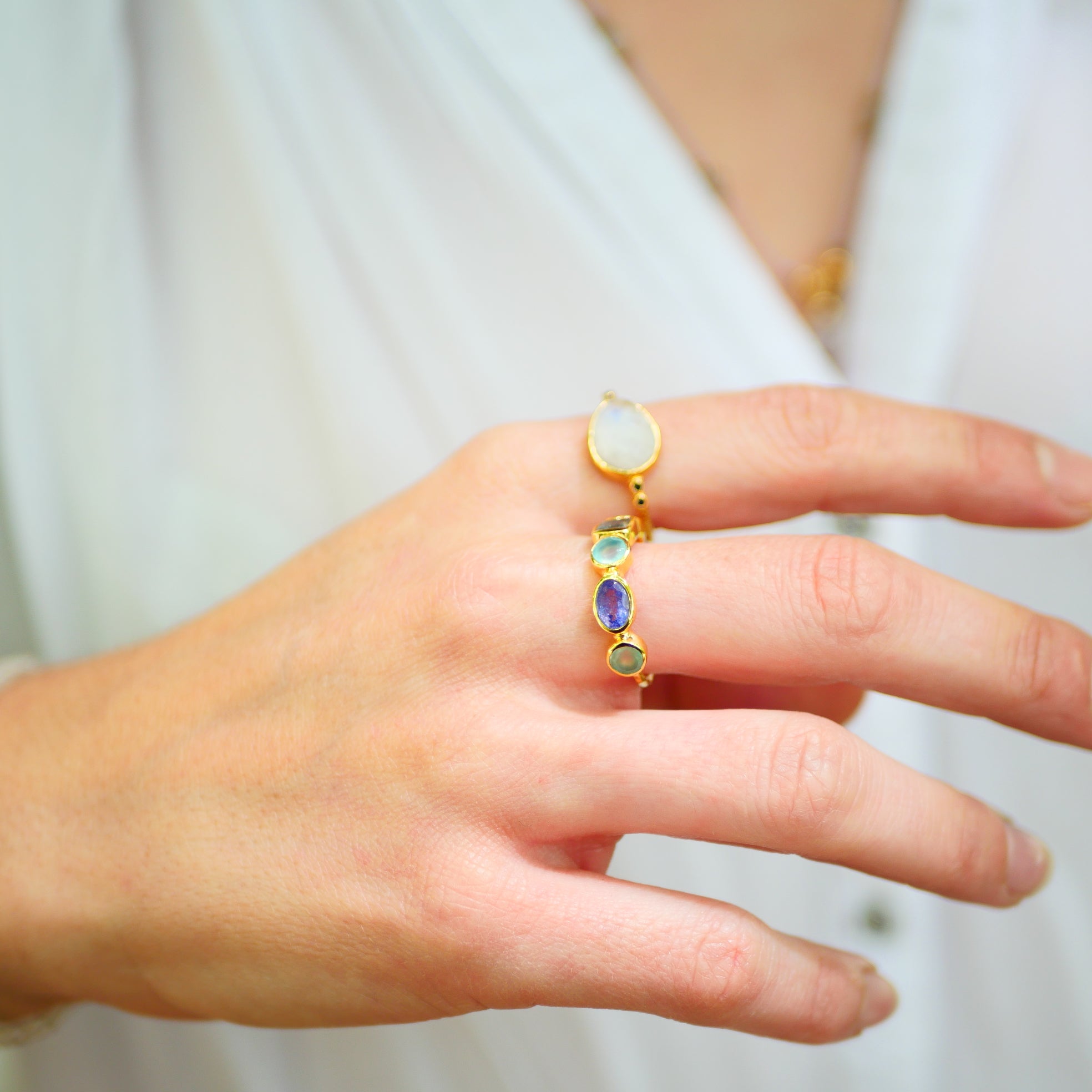 Bague en laiton doré or 2 microns 18 carats réglable de la taille 54 à 62, ornée de Tanzanite, Calcédoine, Labradorite et Pierre de lune