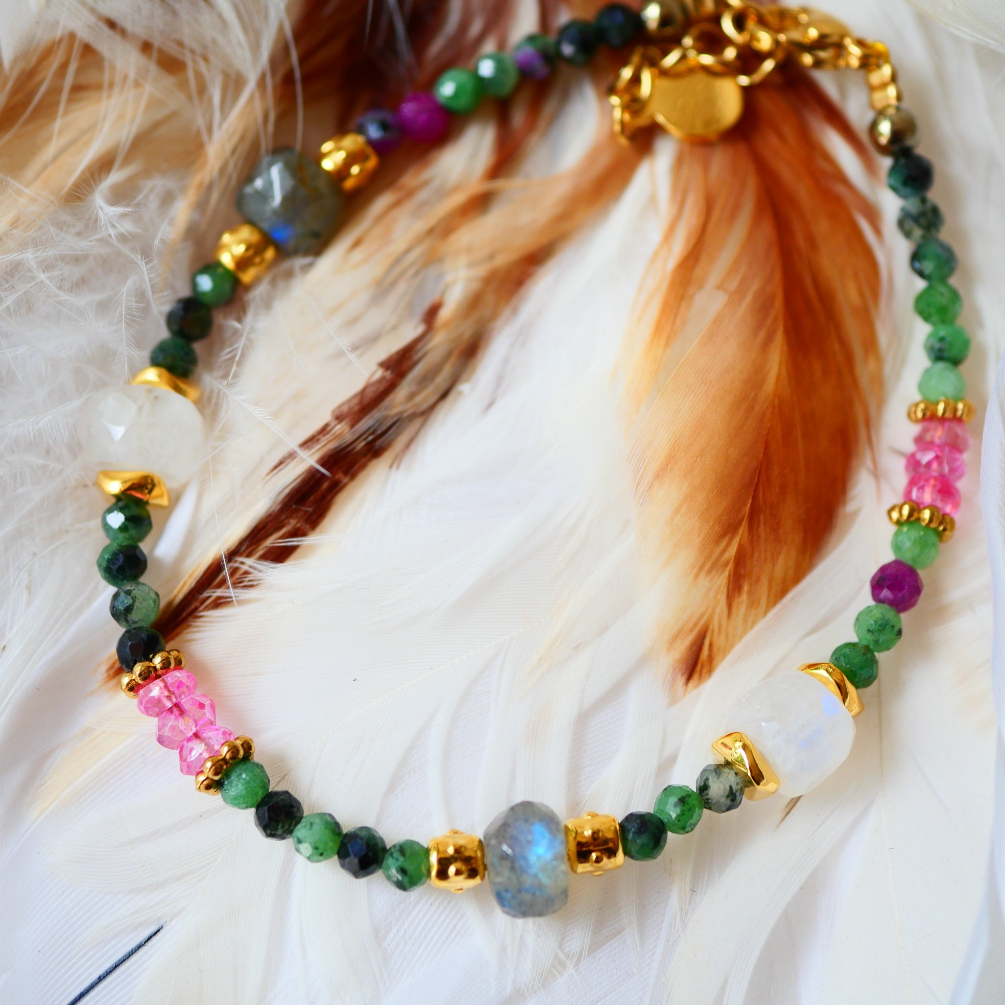 Bracelet en acier inoxydable, composé de rubis zoisites, de topazes roses, de labradorites, de pierres de lune et de breloques dorées or fin.