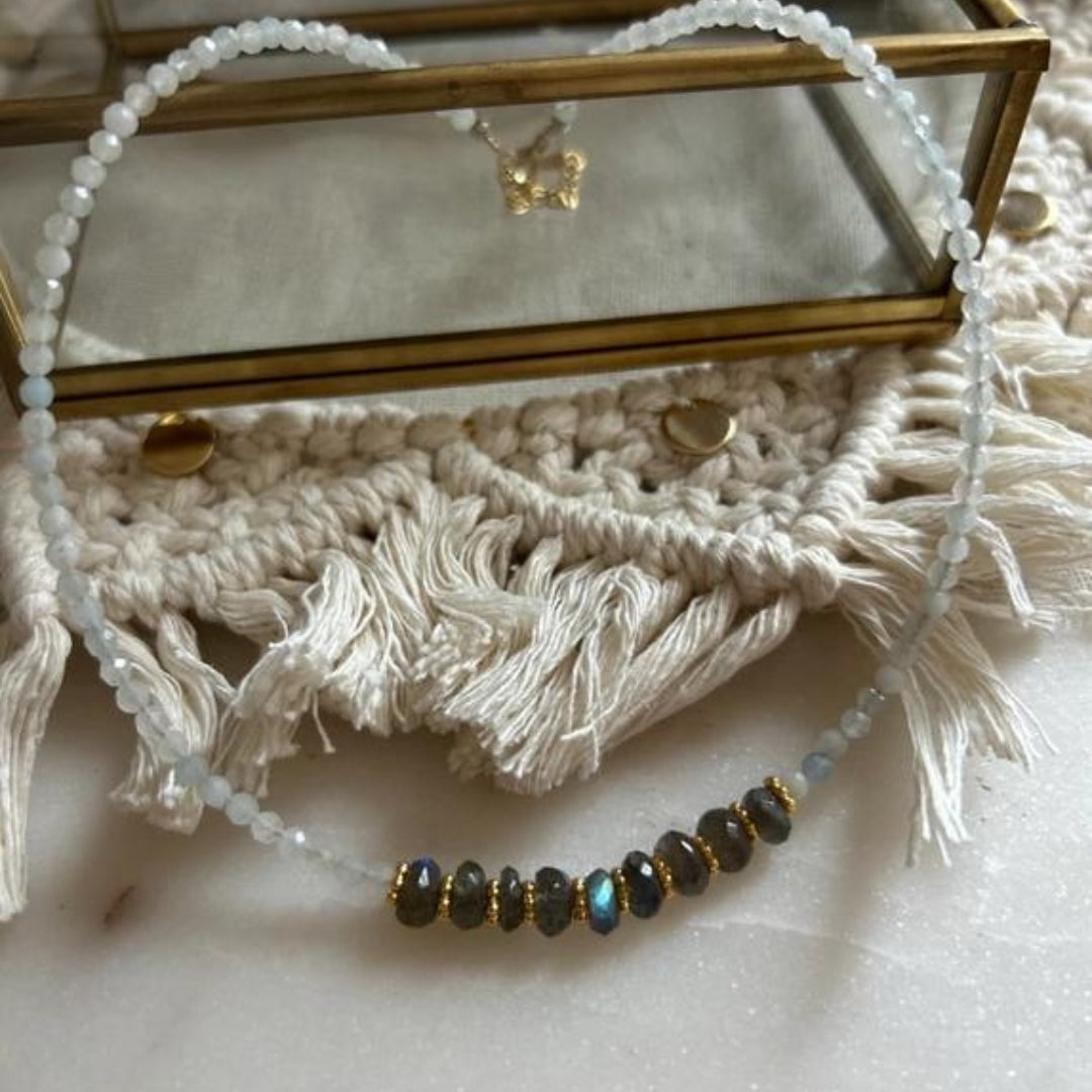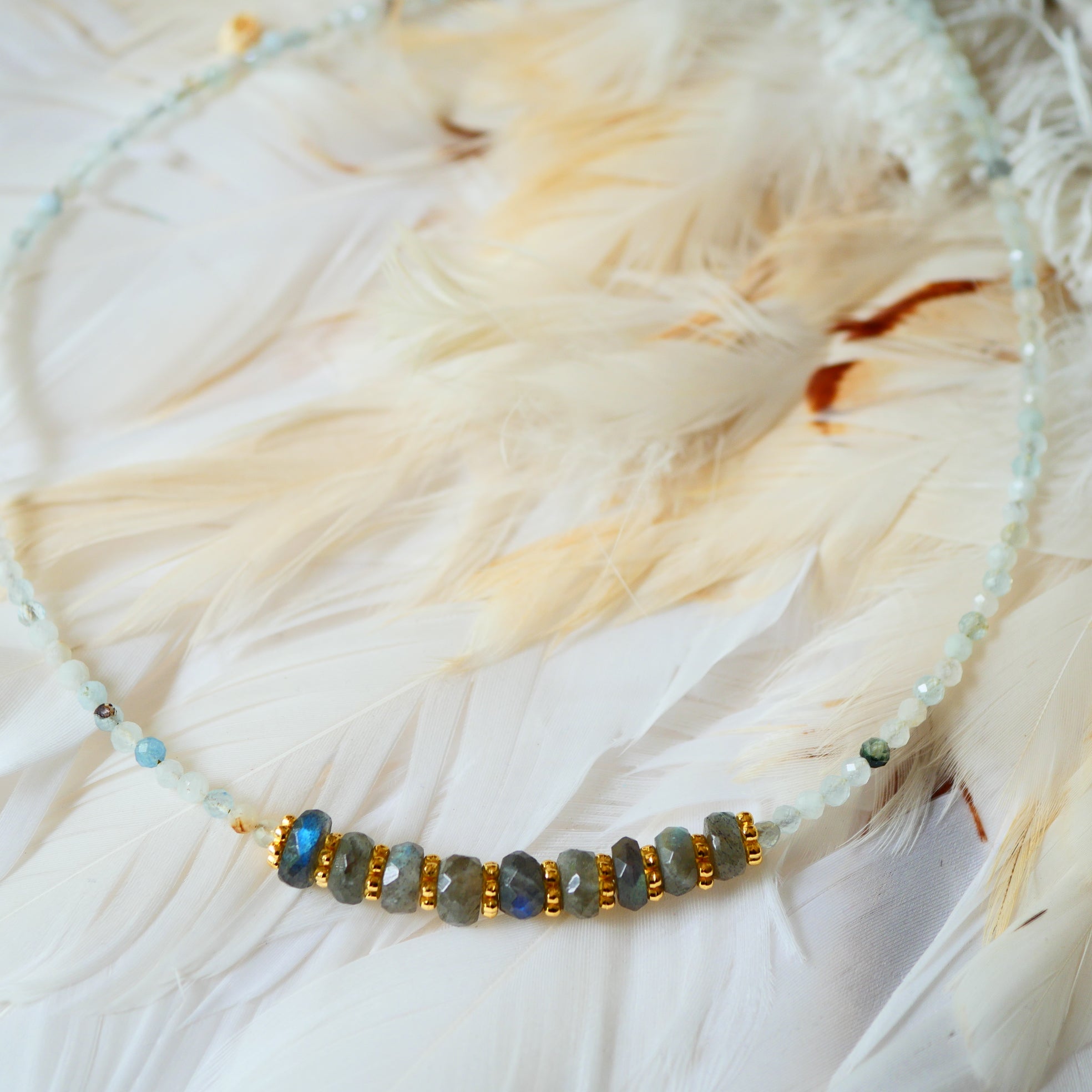 Collier en acier inoxydable, composé d'aigues marines,labradorites et de breloques dorées or fin