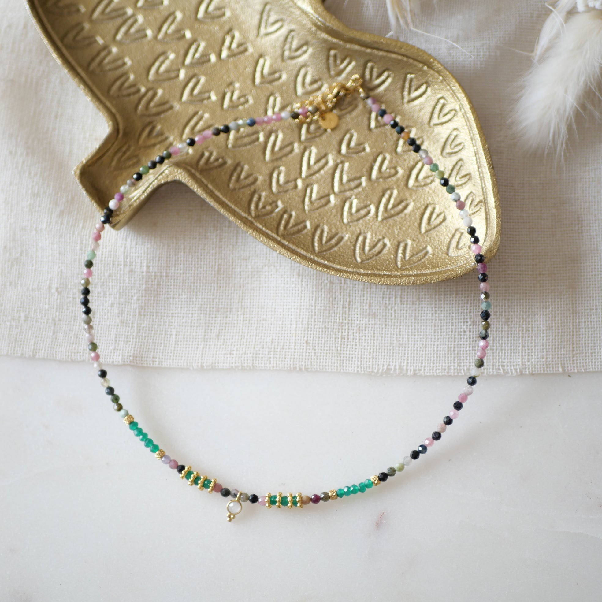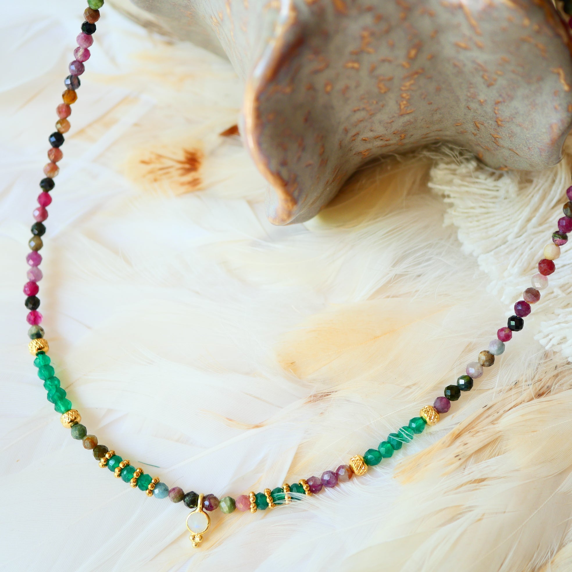 Collier en acier inoxydable, composé de tourmaline, d’onyx vert, de breloques dorées or fin et d’une pierre de lune arc-en-ciel.