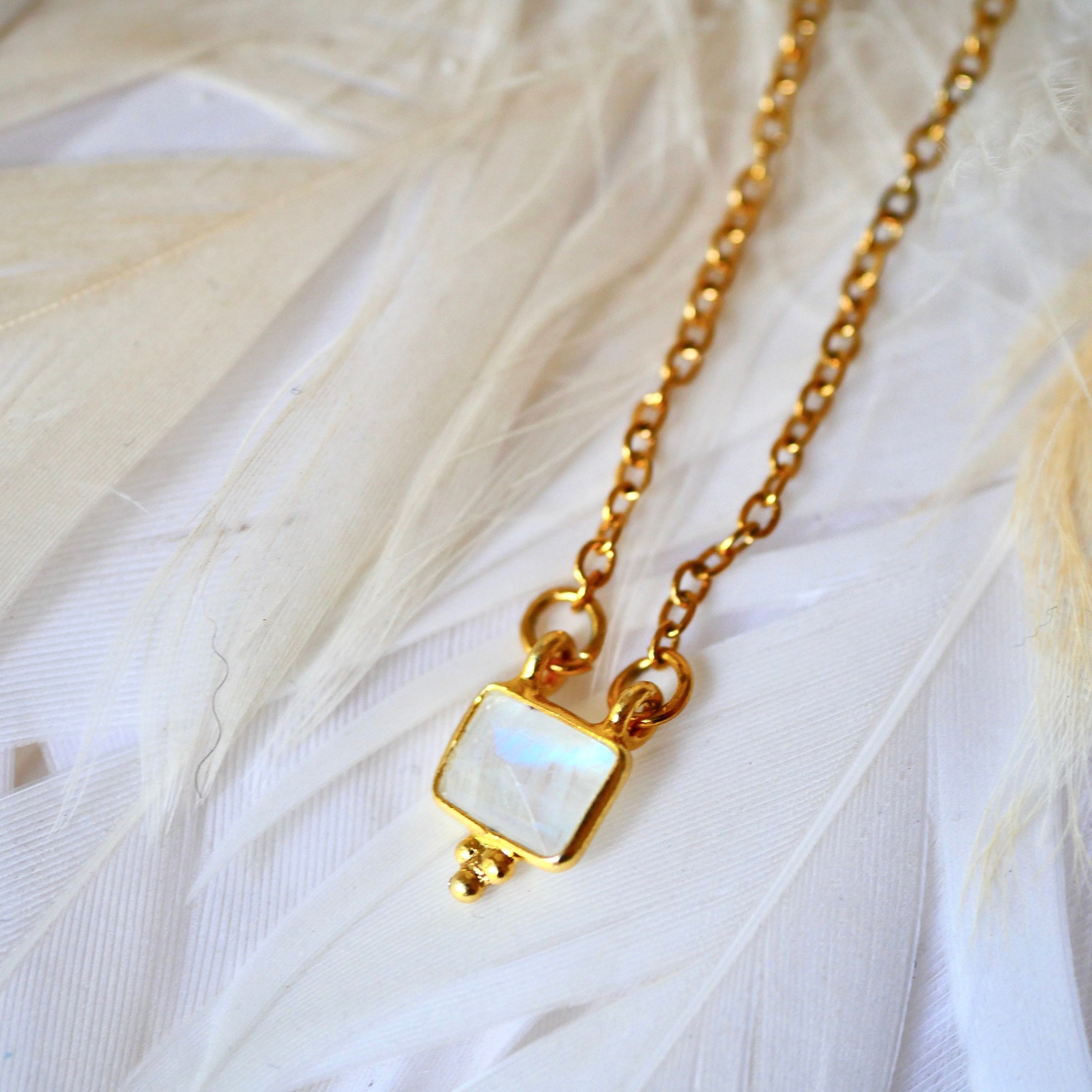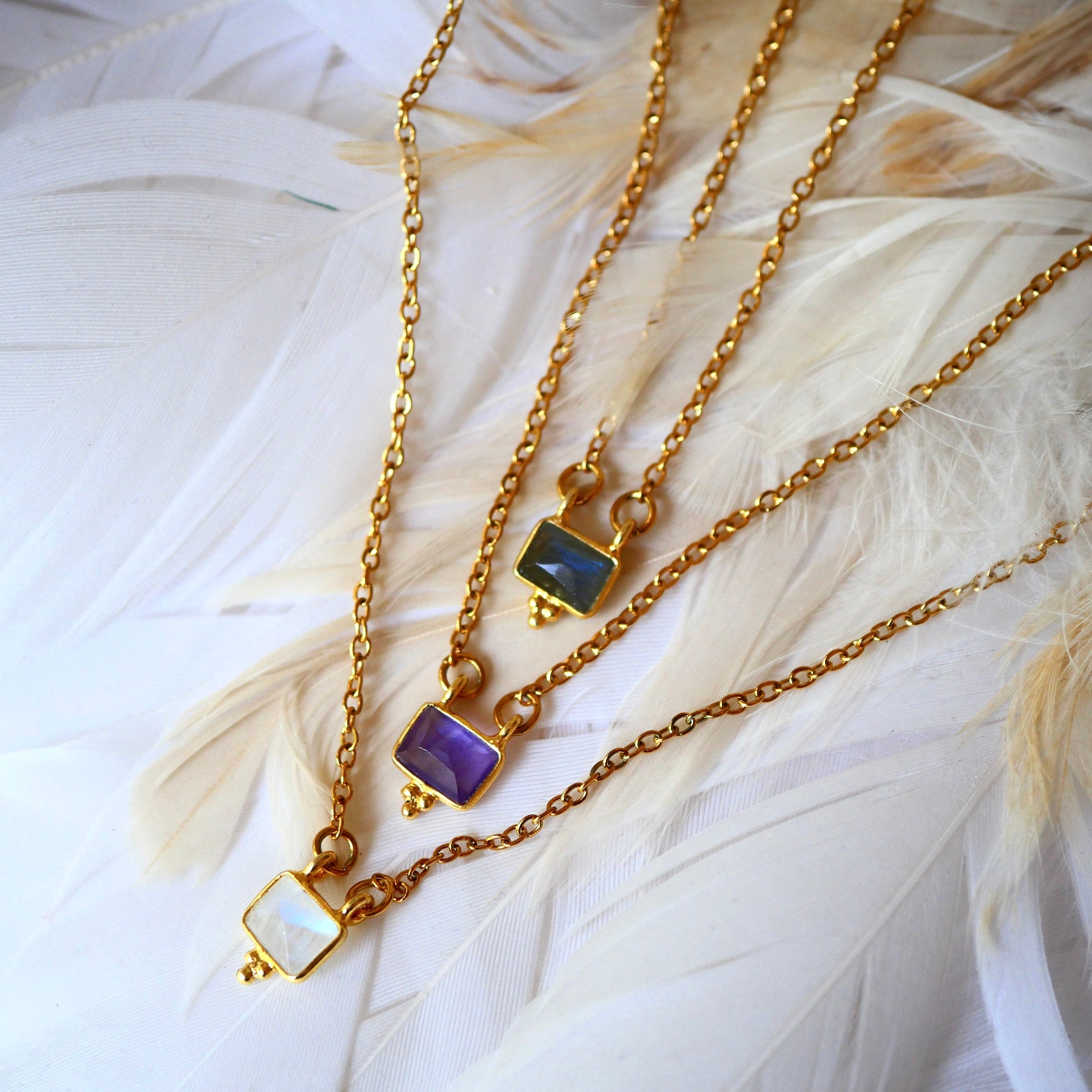 Collier en acier inoxydable composé d'une breloque dorée or fin avec une pierre au choix : pierre de lune, améthyste ou labradorite