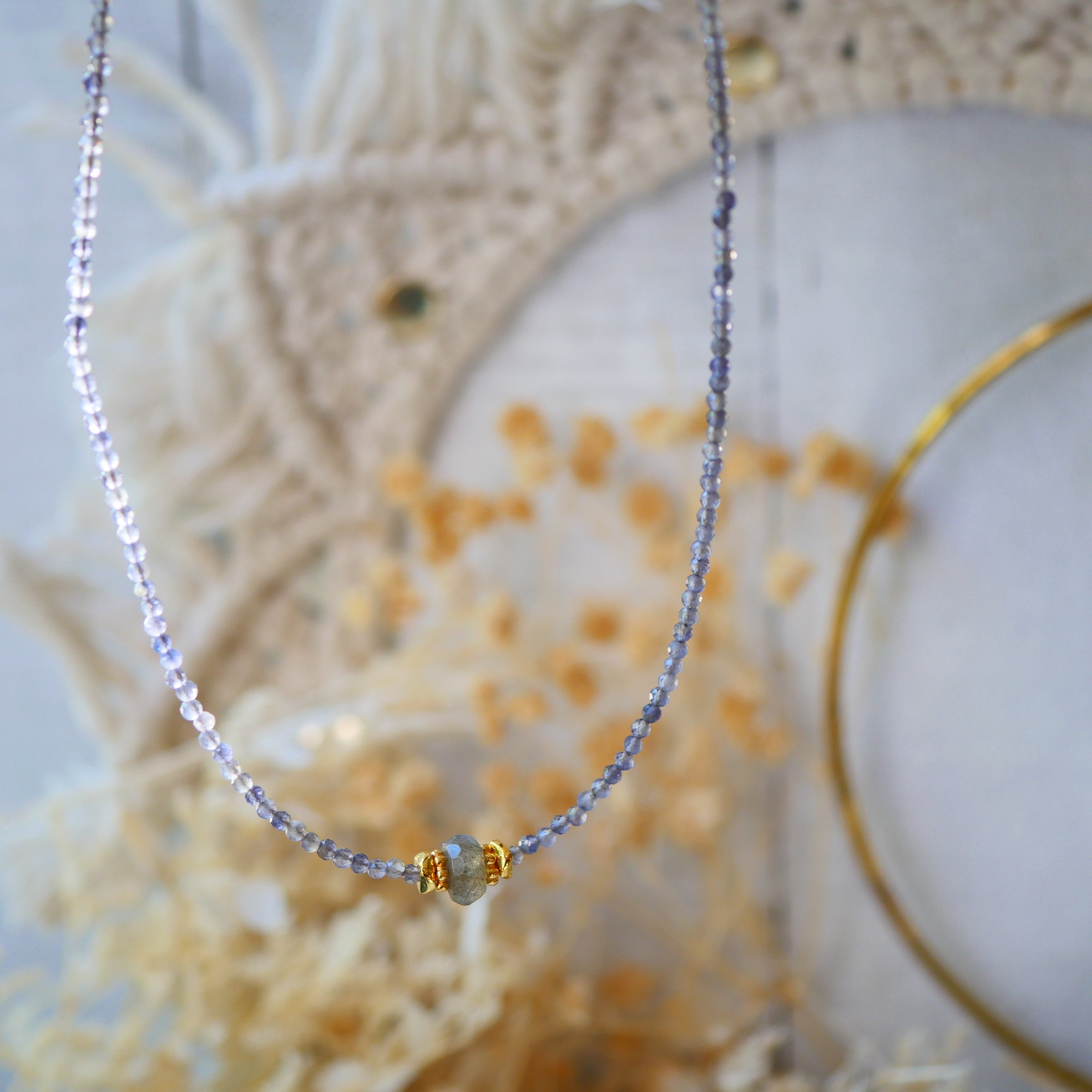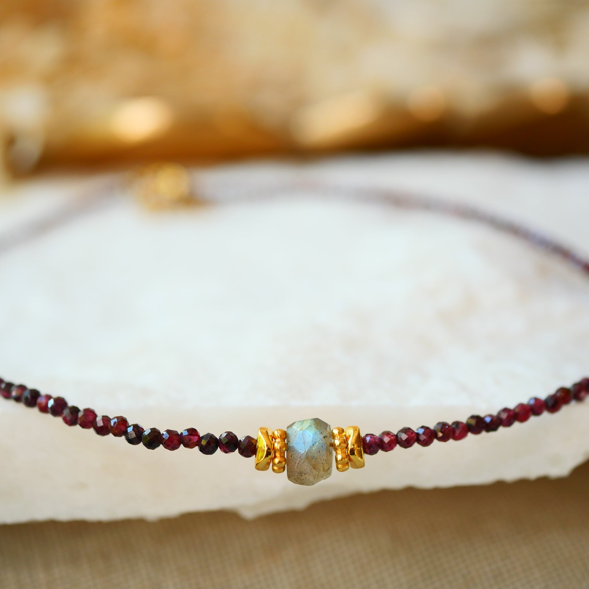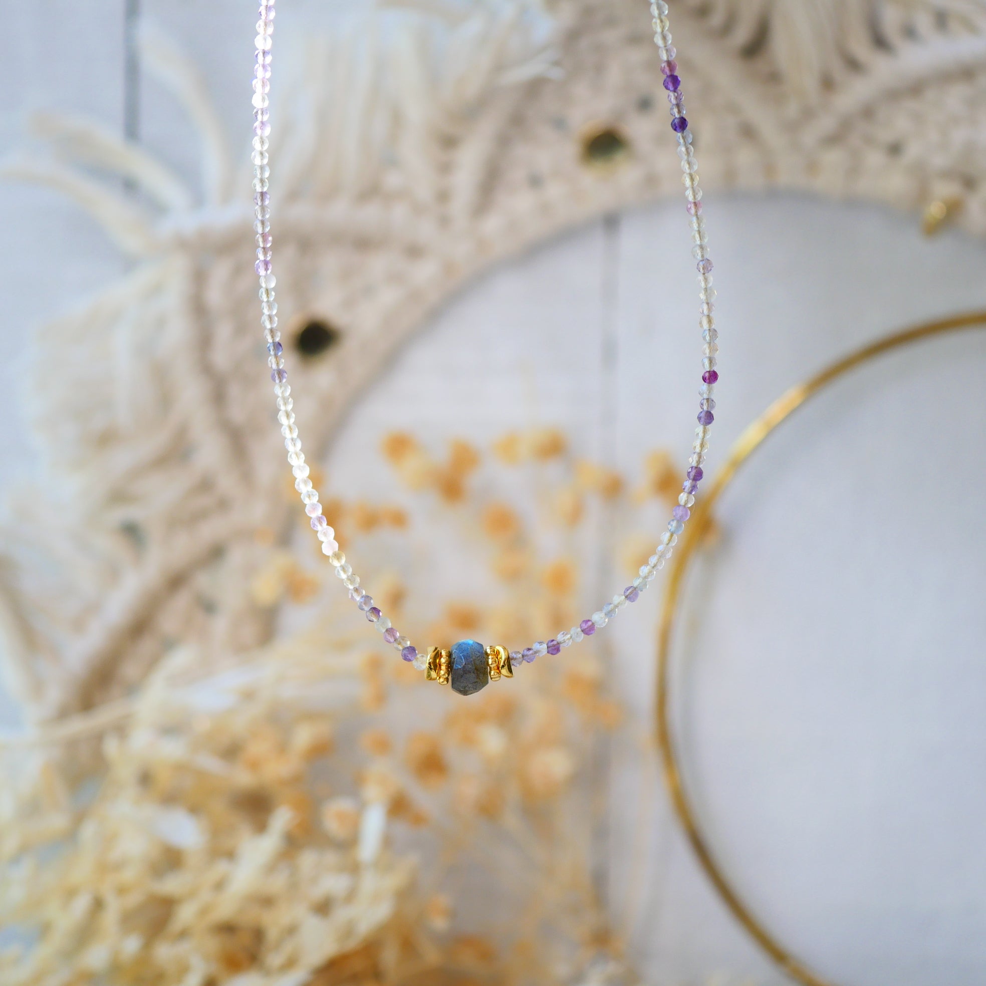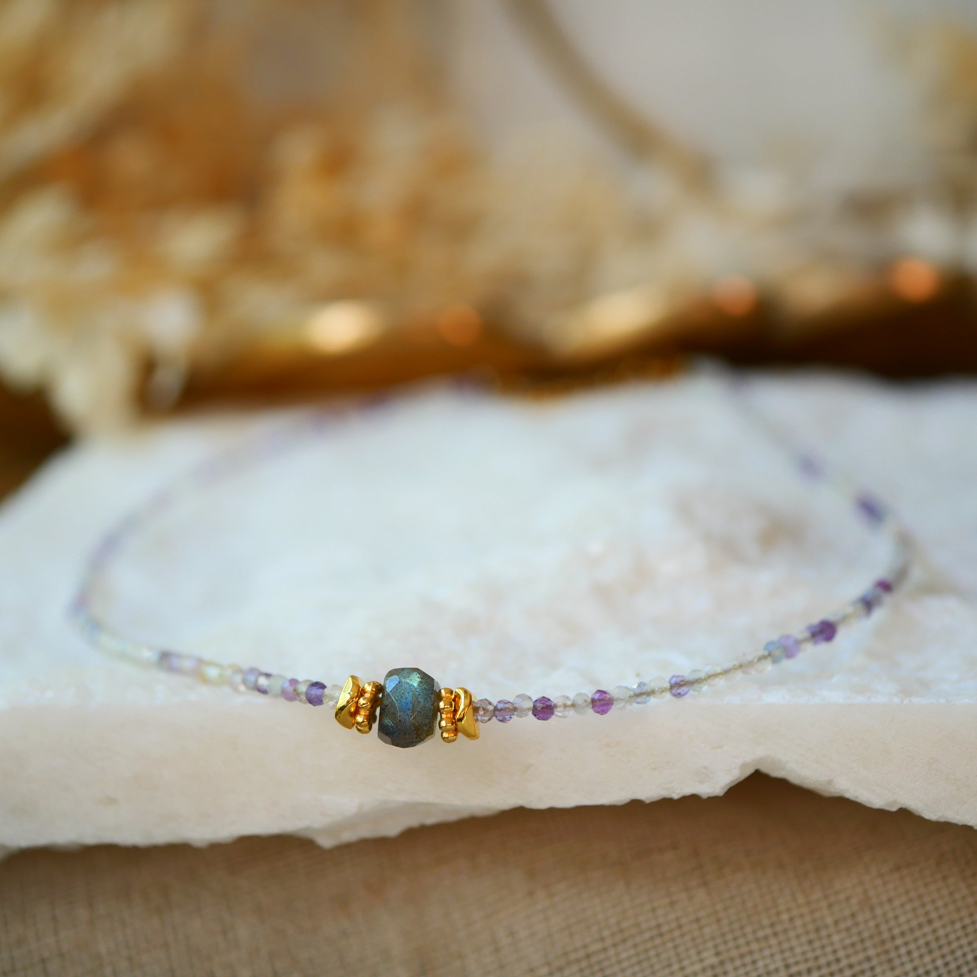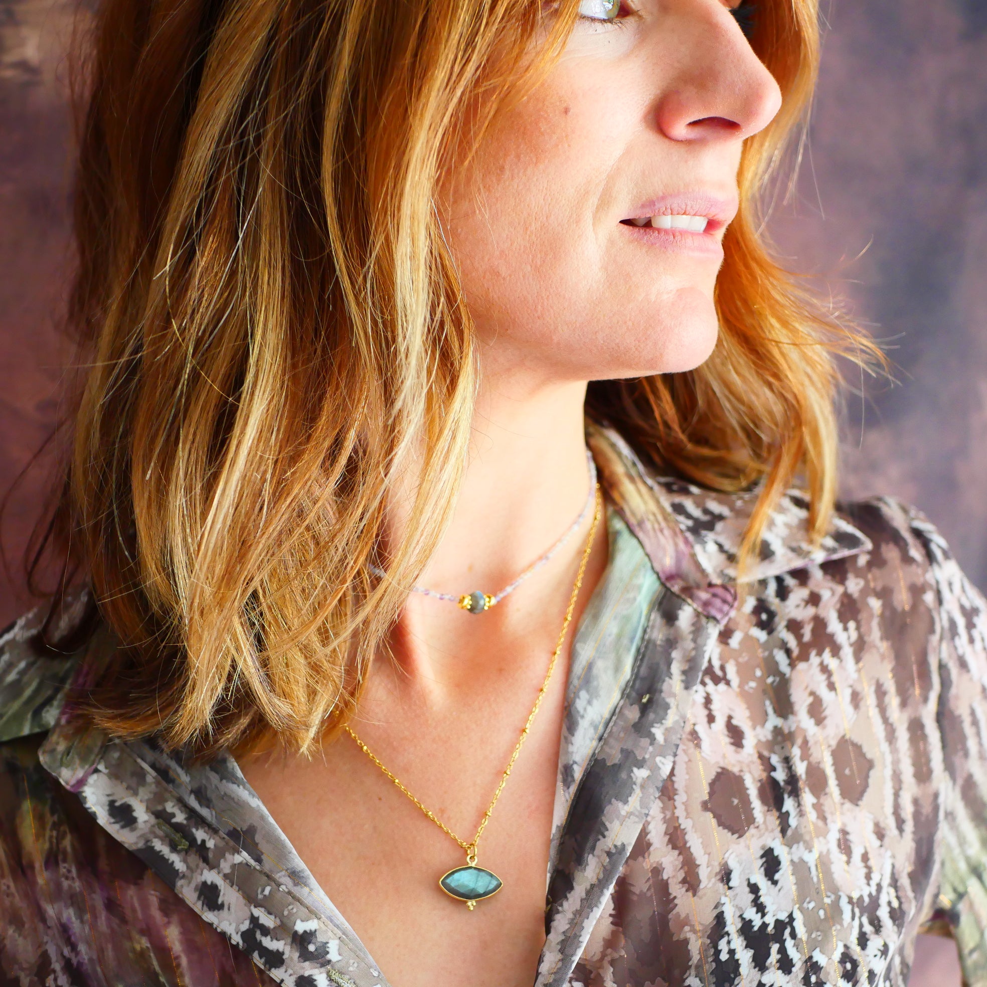 Éveillez votre intuition et votre énergie intérieure avec notre collier en labradorite, agrémenté d'une pierre précieuse au choix : grenat, fluorite ou iolite. Conçu pour les femmes qui s'engagent sur le chemin du développement personnel, ce collier est l'accessoire idéal pour accompagner votre pratique du yoga et nourrir votre quête spirituelle.