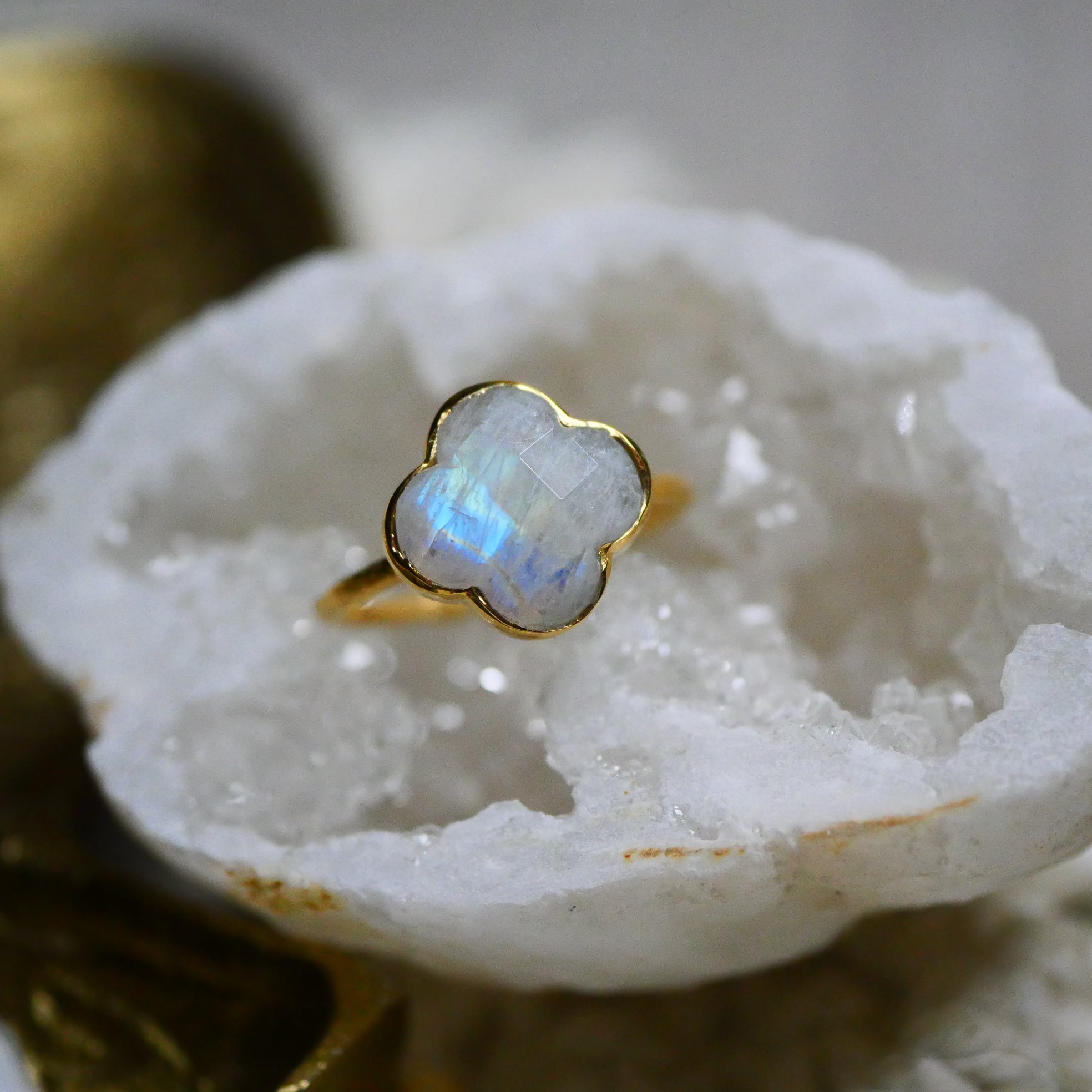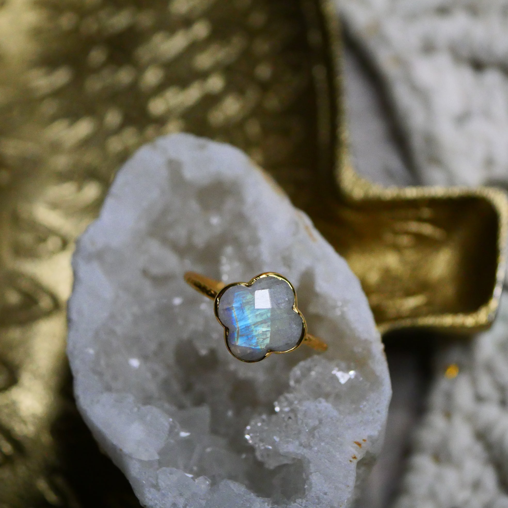 Verstellbarer Ring aus 2 Mikron vergoldetem Messing , verziert mit einem Labradorit oder einem Regenbogenmondstein (auch weißer Labradorit oder Peristerit genannt) in Form eines Kleeblatts.