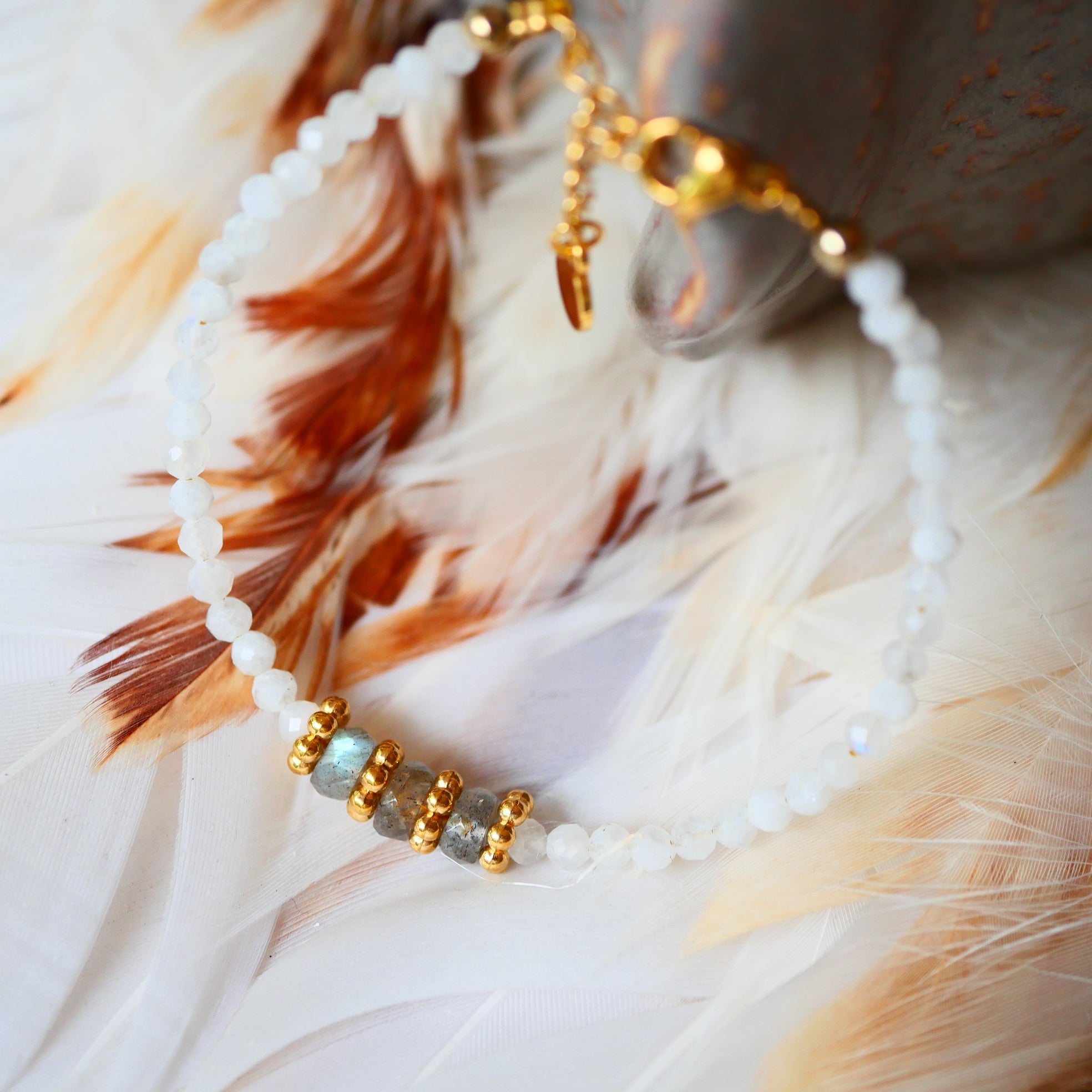 Kamala besteht aus feinen Natursteinen, die sorgfältig aufgrund ihrer Schönheit und heilenden Eigenschaften ausgewählt wurden. Labradorite verleihen der Bohemian-Ästhetik des Armbands einen Hauch von Magie und erinnern mit ihren schimmernden Reflexen an das Nordlicht.