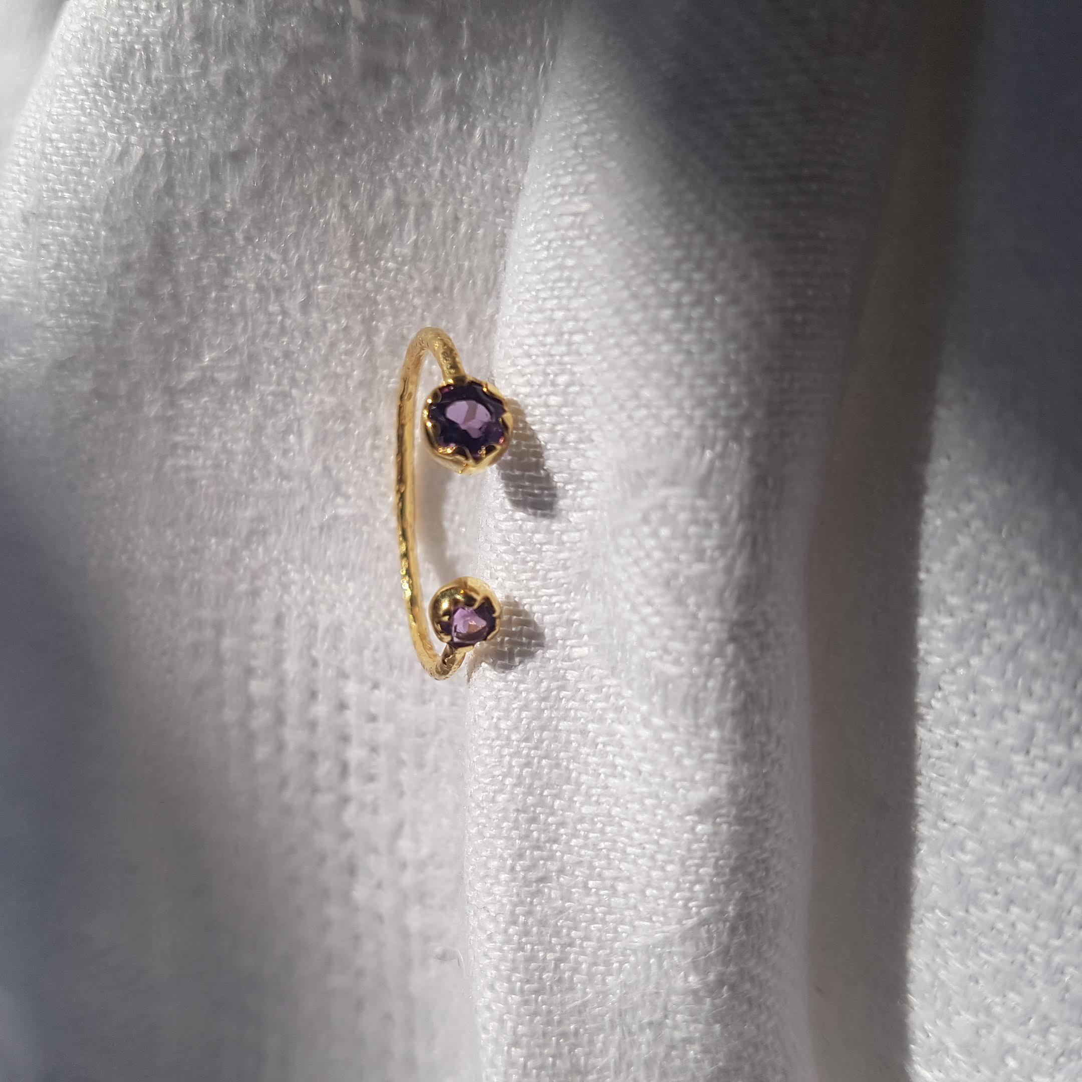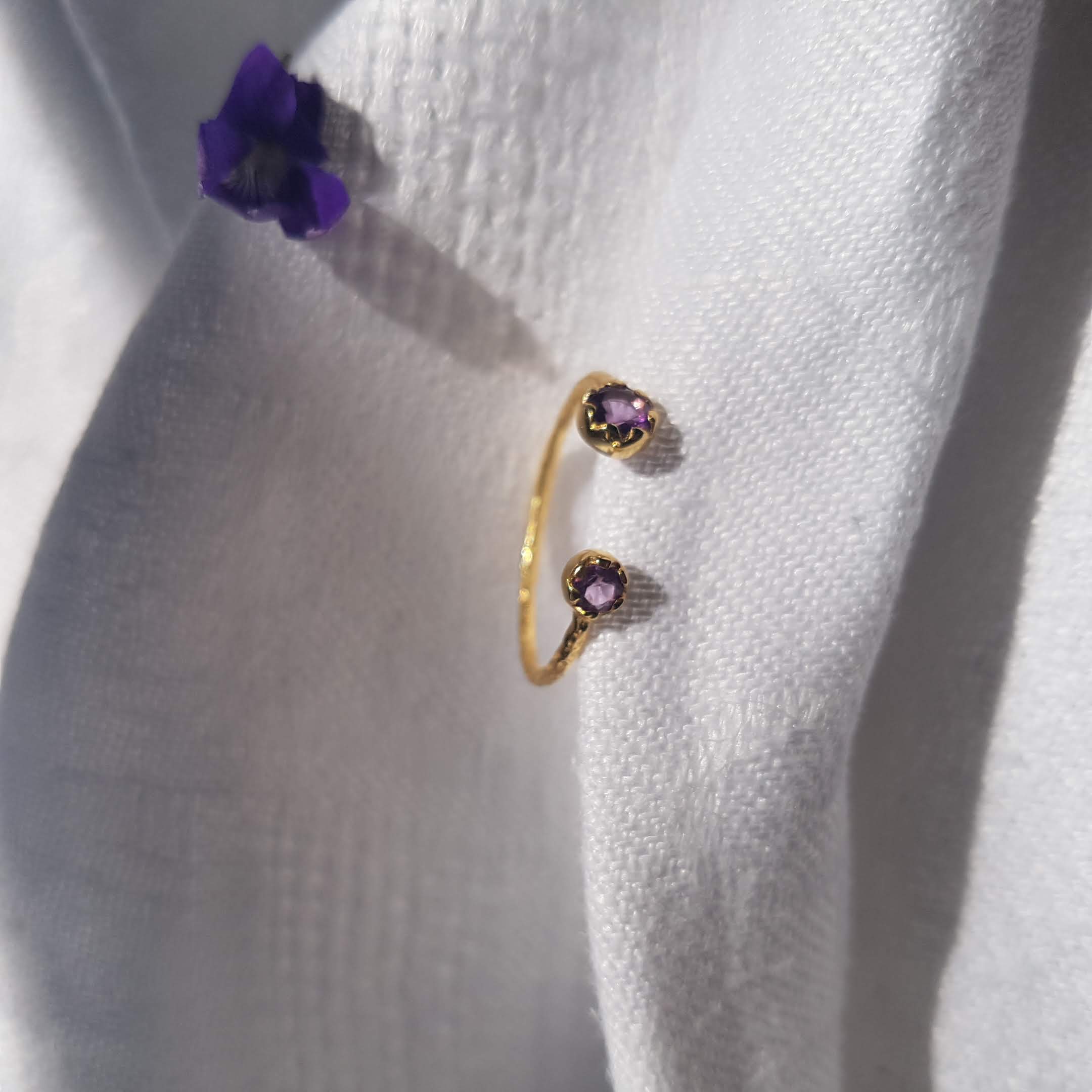 Bague en laiton doré or 2 microns 18 carats réglable de la taille 54 à 60, ornée d'améthystes