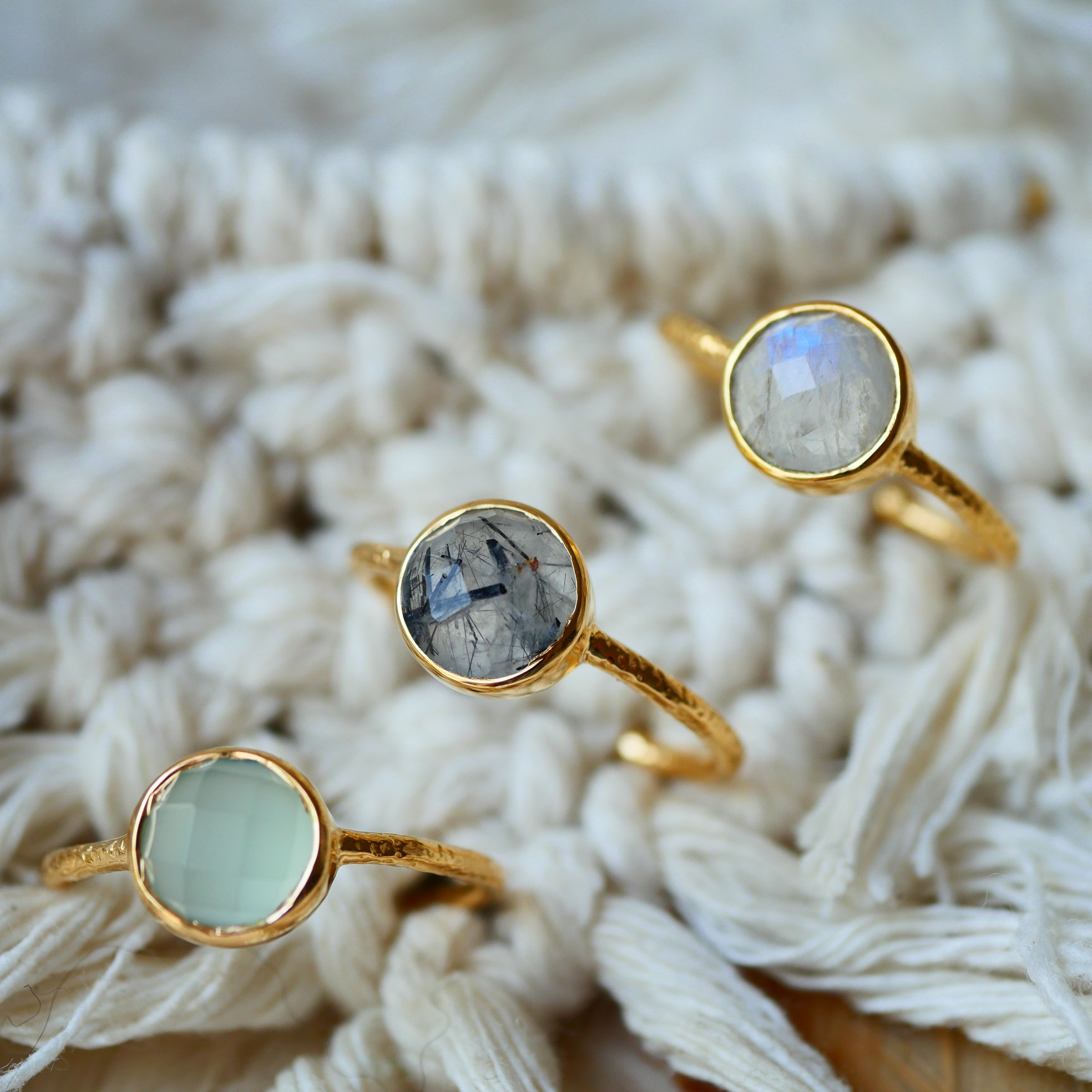 Bague en laiton doré ou 2 microns 18 carats réglable , ornée d'une pierre au choix : Calcédoine, Rutile noir, Pierre de Lune
