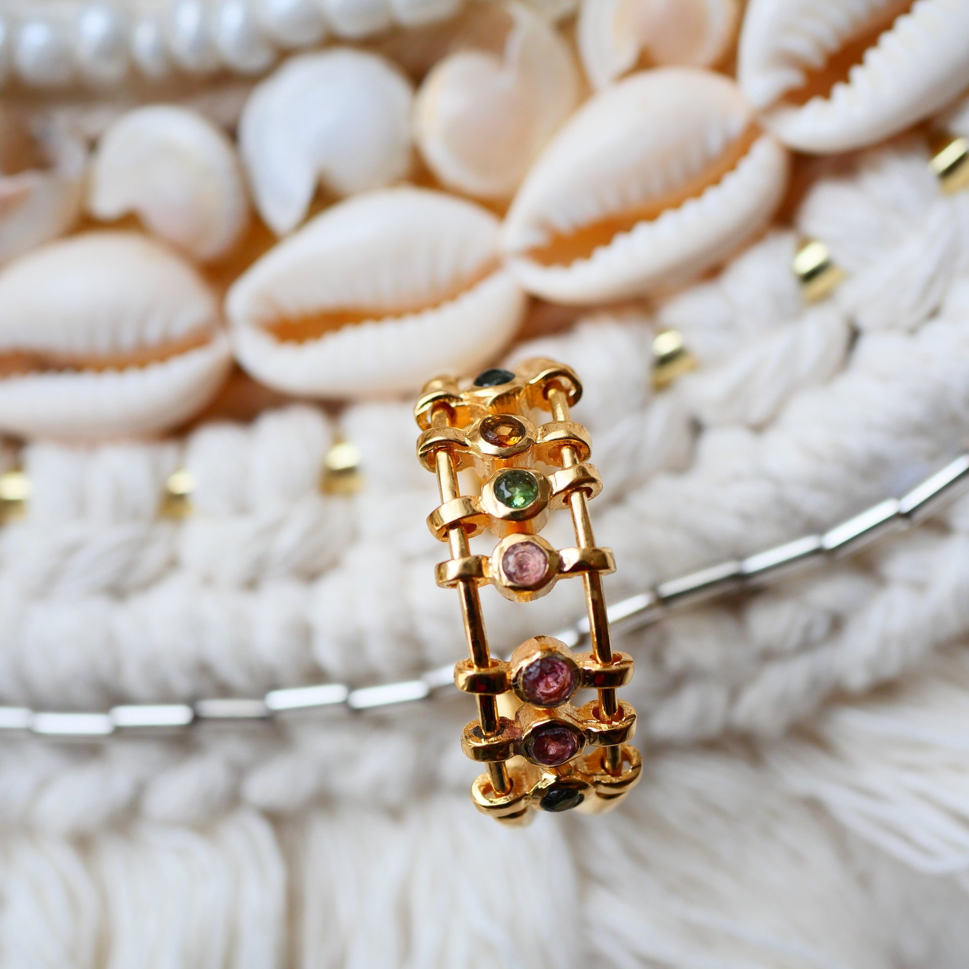 La bague RANG est ornée de tourmalines multicolores, apportant équilibre et joie. Chaque bague est unique grâce aux variations de couleurs des pierres.
