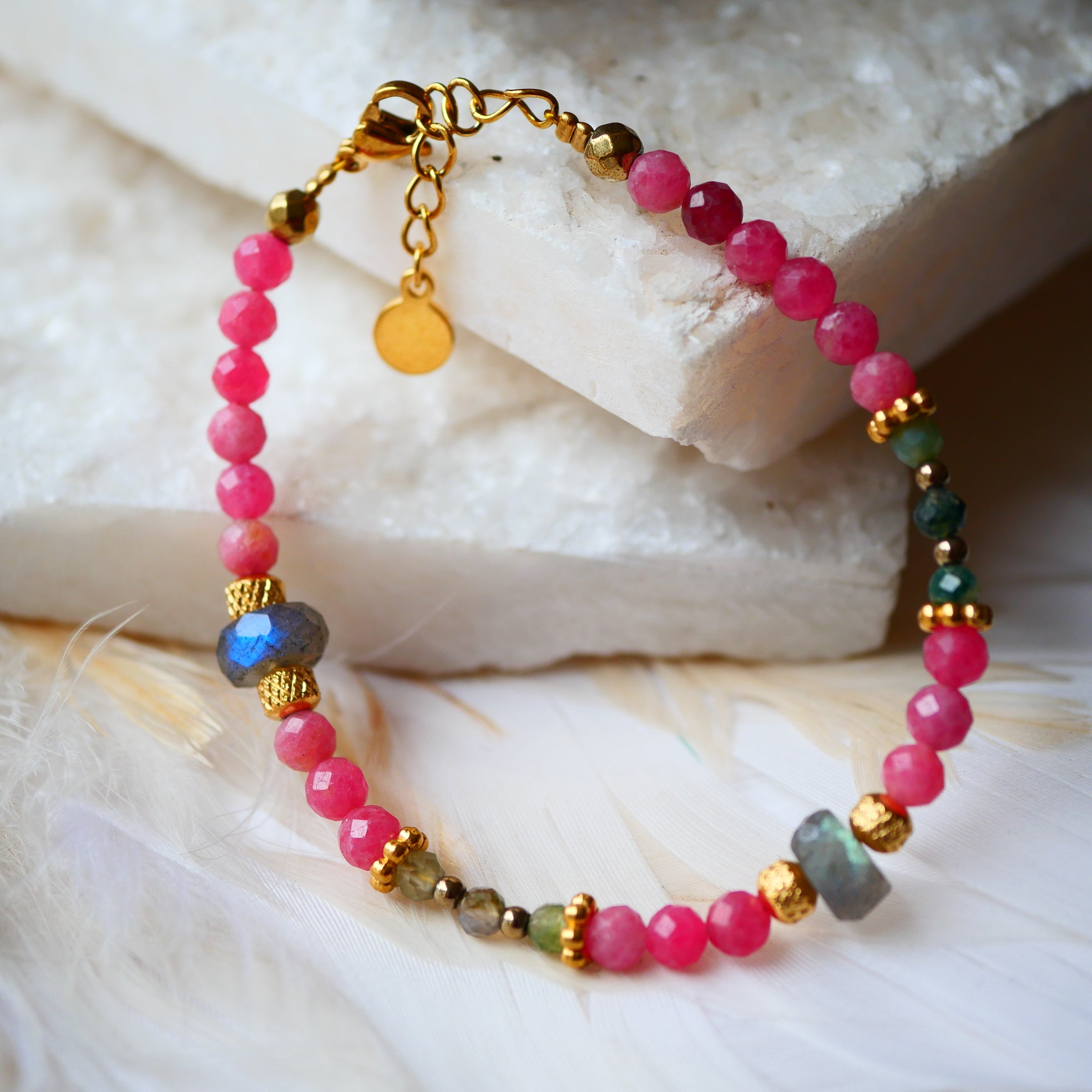 Le bracelet SUKOON est un bijou apaisant qui favorise l'équilibre émotionnel. La rhodonite apporte douceur et compassion, l'agate indienne harmonise les énergies, et la labradorite protège.