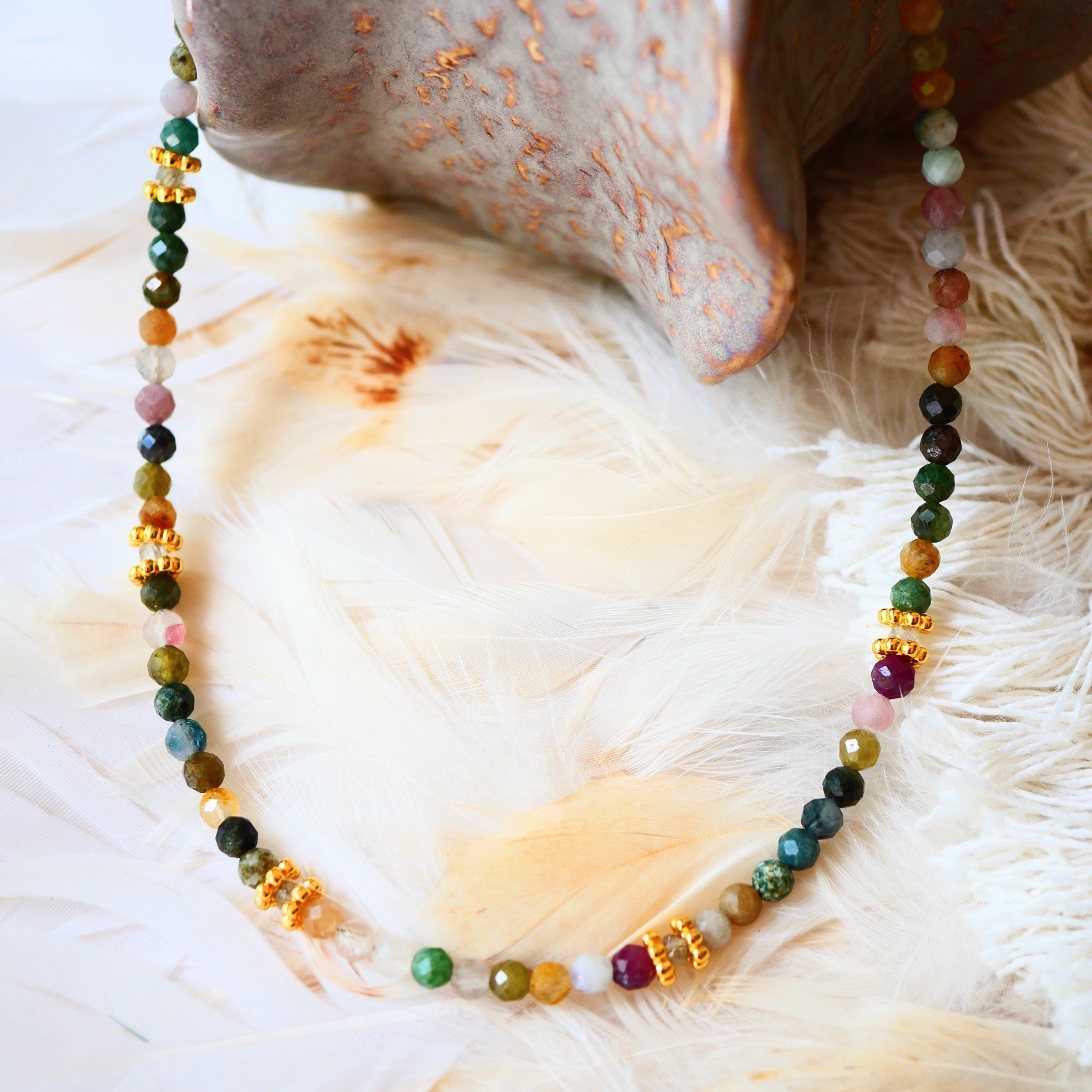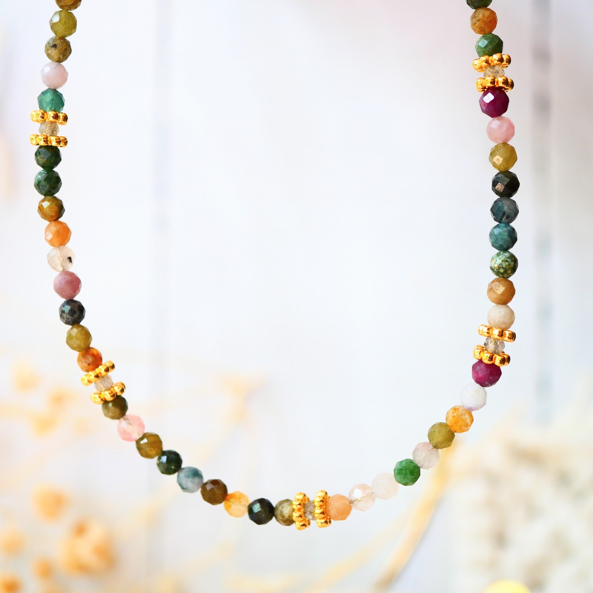 Collier en acier inoxydable, composé de tourmalines 4mm, de labradorites et de breloques dorées or fin.