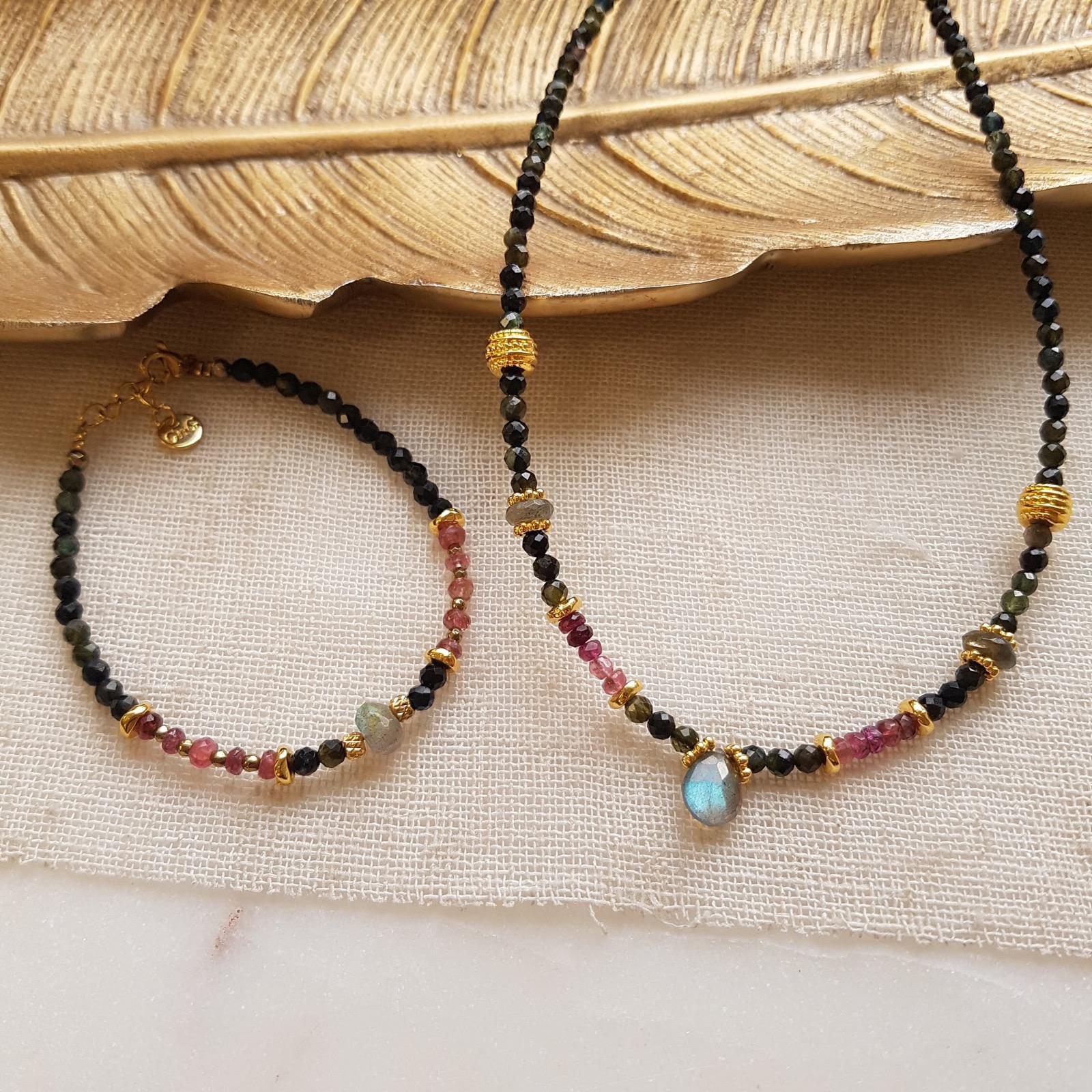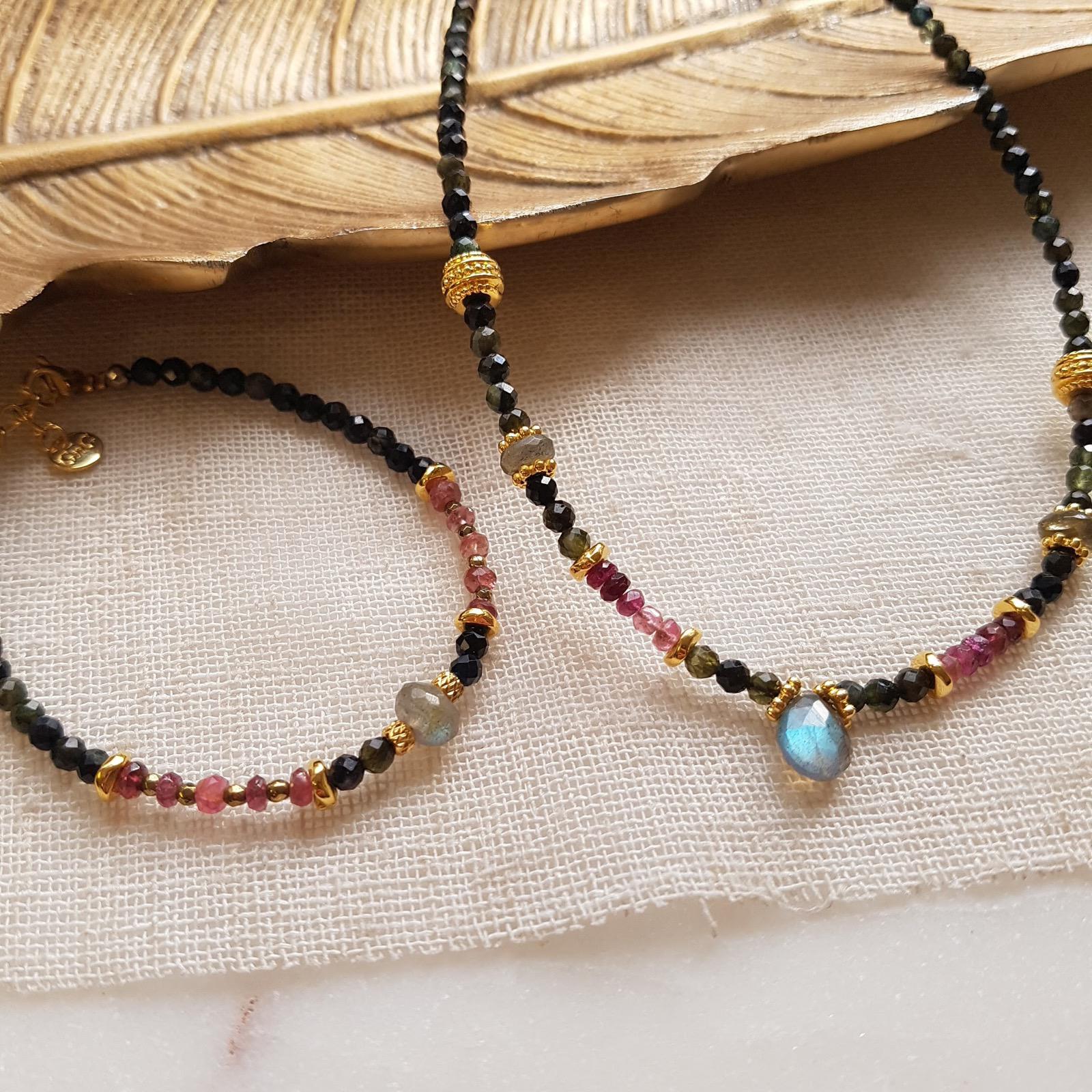 - Collier Mehak : Collier en acier inoxydable, composé de tourmaline verte, tourmaline rose, de breloques dorées or fin et d’une labradorite en forme de goutte de 4mm. Mesure environ 40+5cm de rallonge