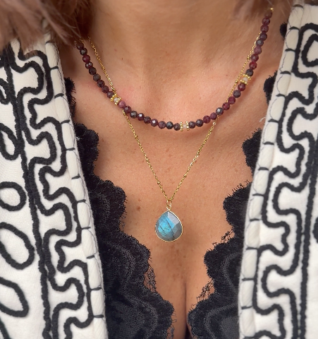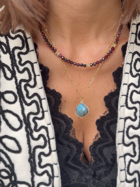 - Collier Paola grenat (Collier composé de grenats, zironcs et charms dorés à l'or fin. Mesure env 37+5cm de rallonge)