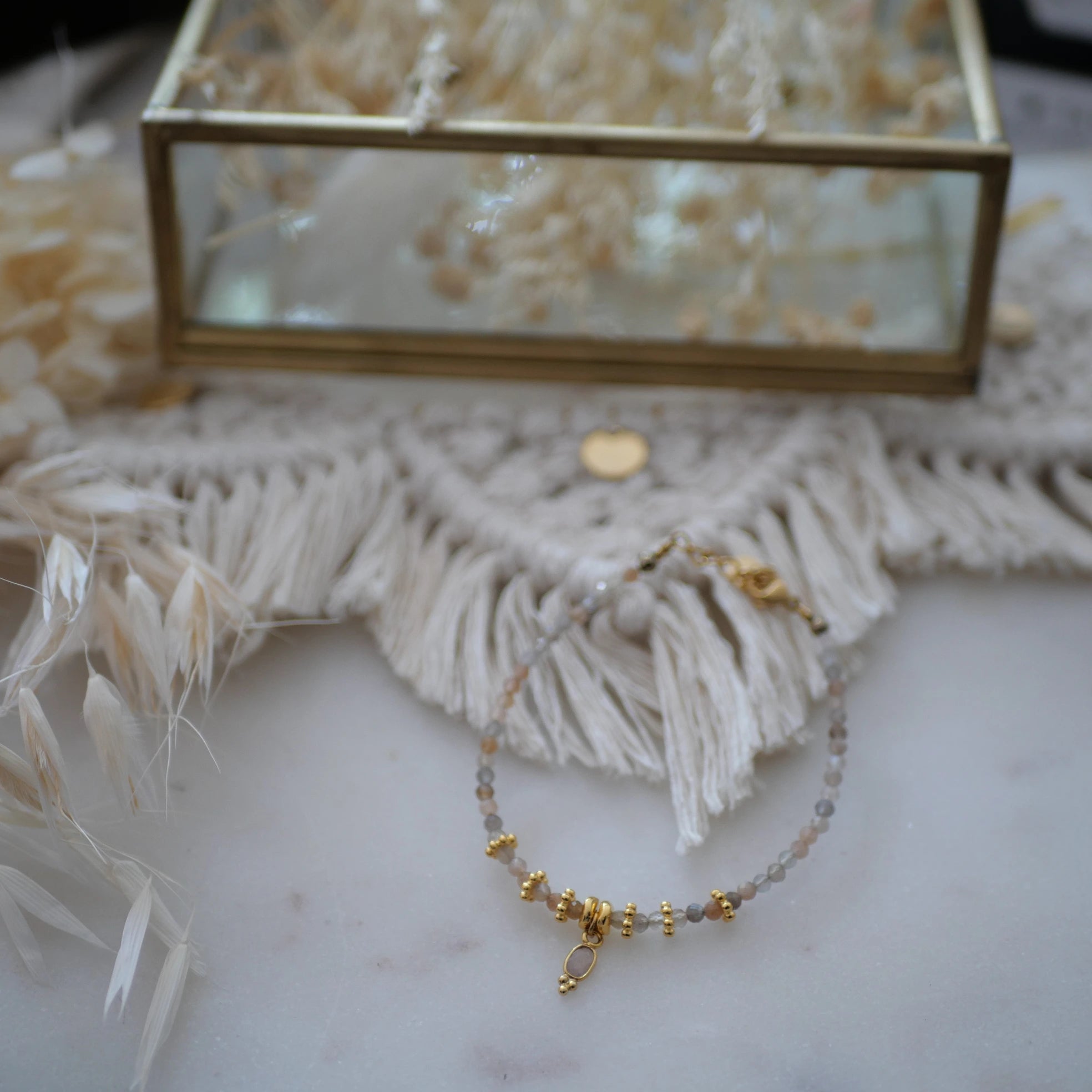 Bracelet en acier inoxydable, composé de pierre de lune orangée et de breloques dorées or fin.