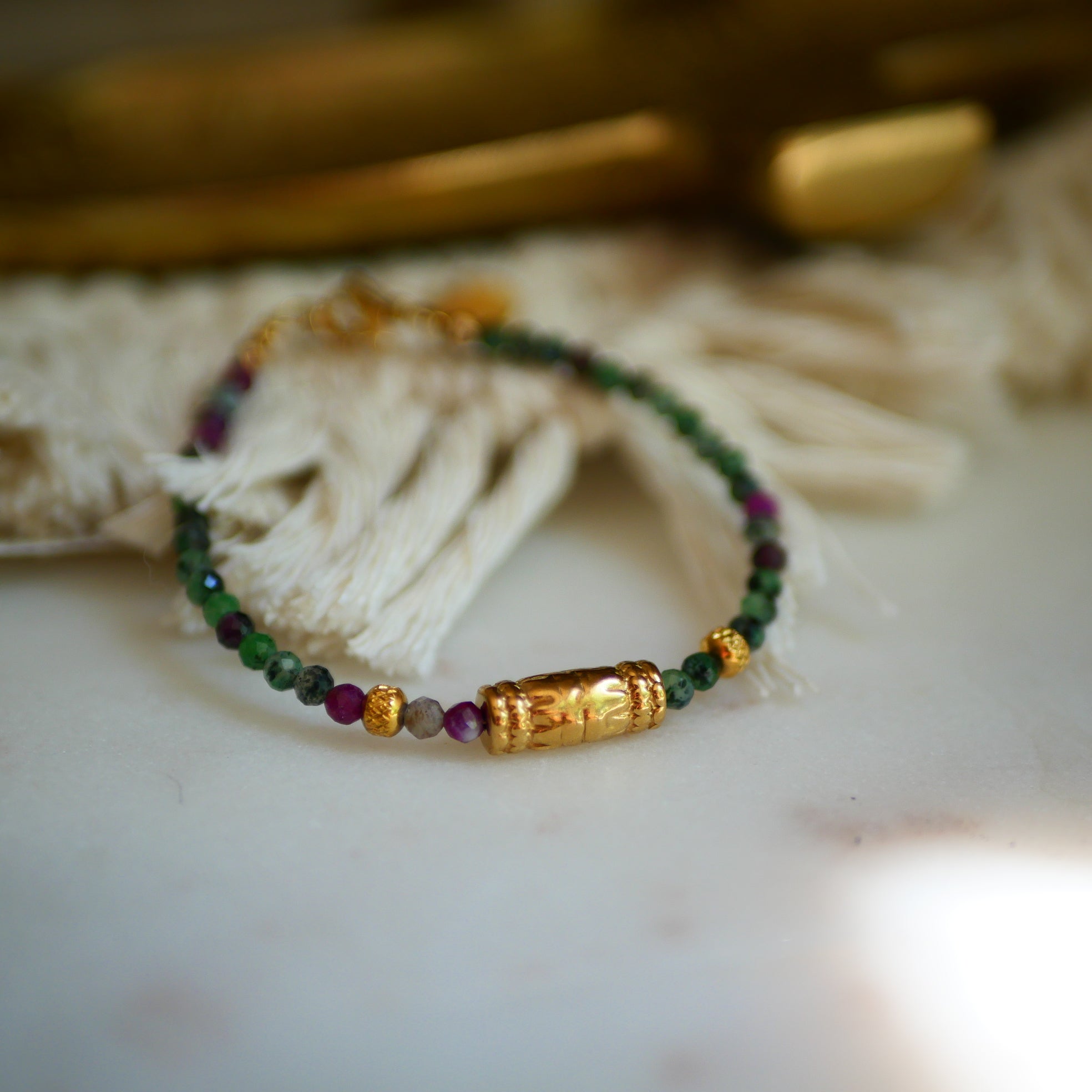 Bracelet en acier inoxydable composé de breloques dorées or fin (talisman) et de pierres au choix : Rubis zoisite ou Pierre de soleil