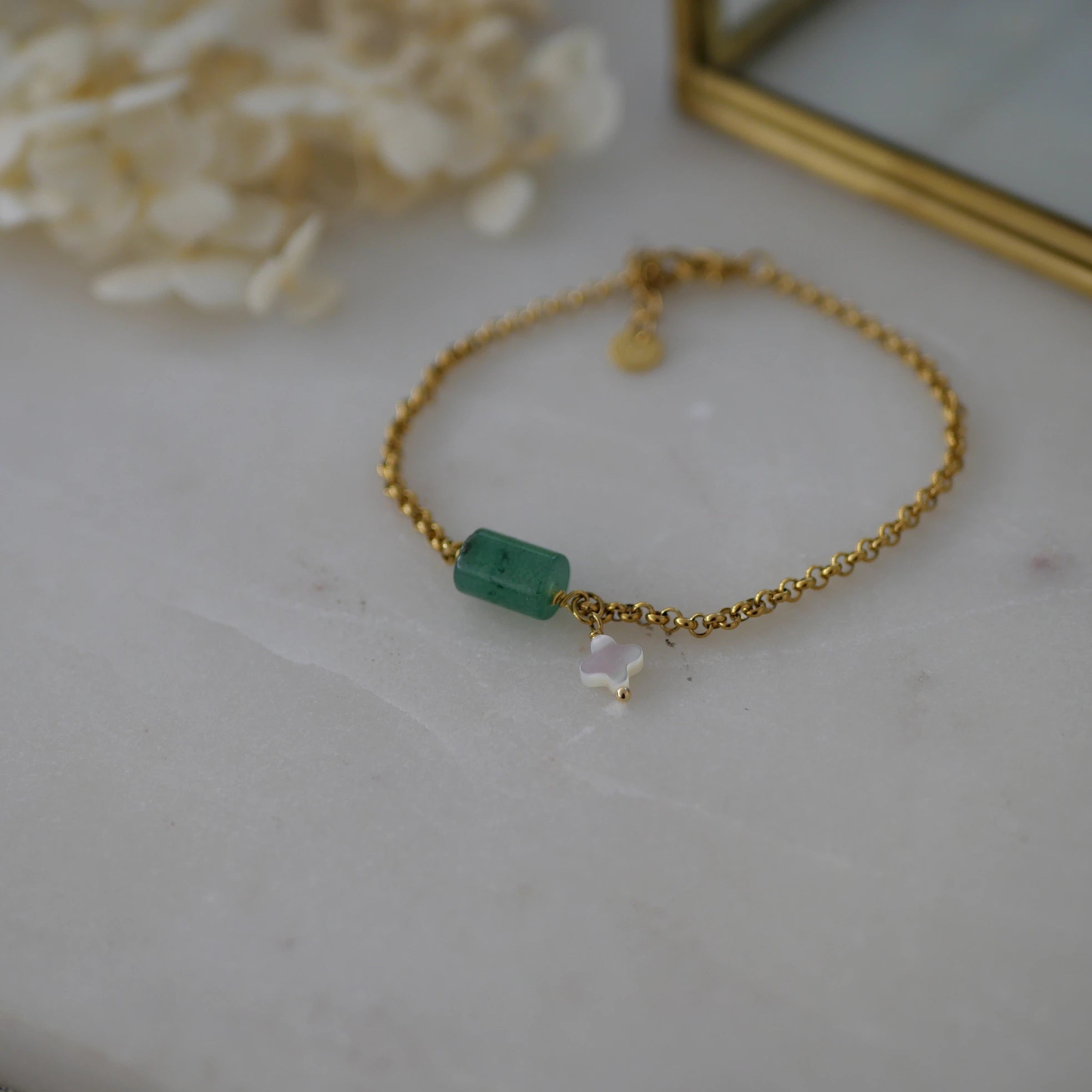 Bracelet avec chaîne en acier inoxydable, composé d'une aventurine et d'un trèfle en nacre.