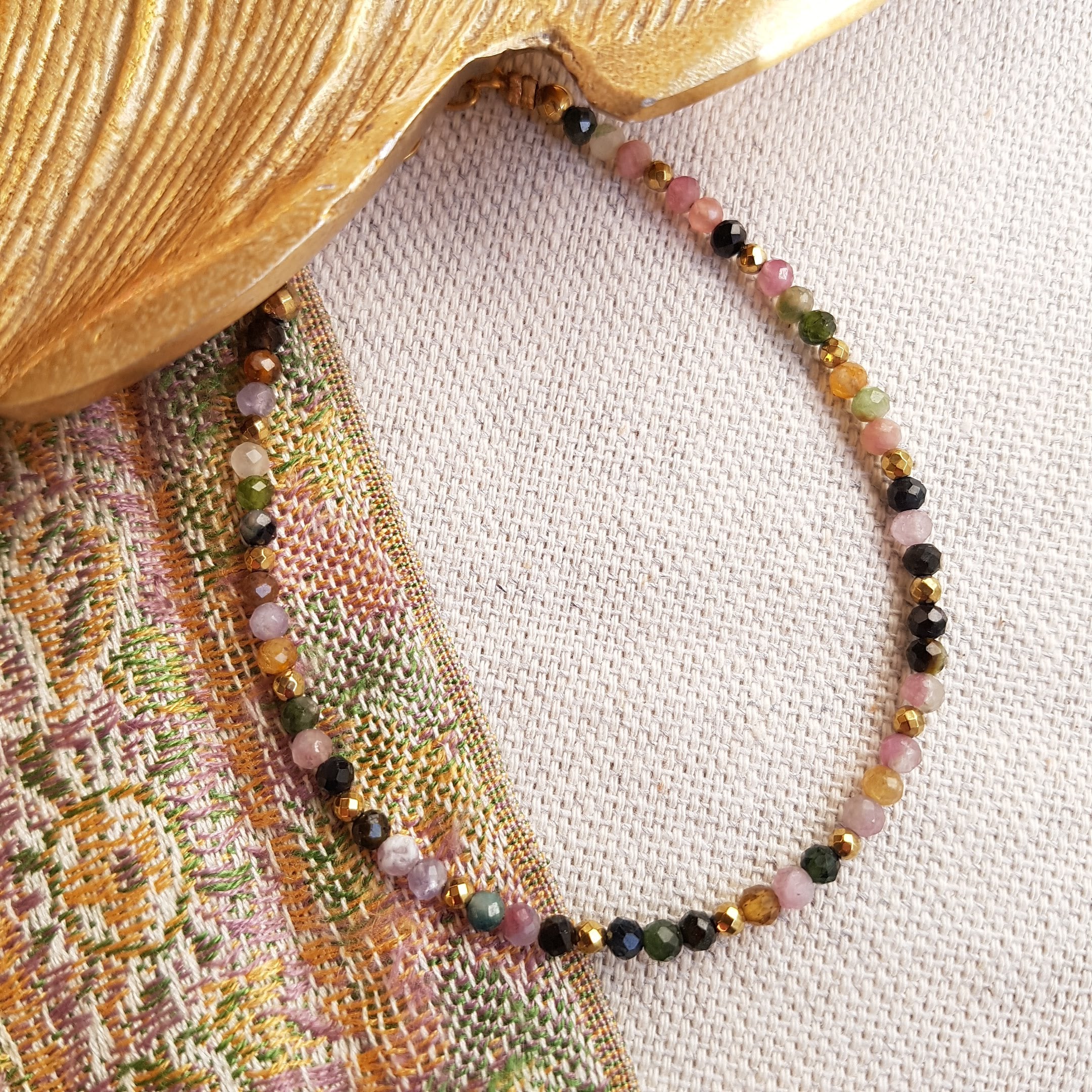 - Le bracelet aux pierres inspirantes, disponible en différentes pierres : agate indienne, lapis lazuli, rubis saphir indien, pierre de lune, turquoise, aigue marine, fluorite, quartz fumé, spinelle et tourmaline.