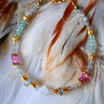 Bracelet composé de labradorites, de topazes rose, de breloques dorées or fin et d'un trèfle en nacre