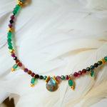 Collier en acier inoxydable composé de Tourmaline, d’Onyx vert, d’une Labradorite et de breloques dorées or fin